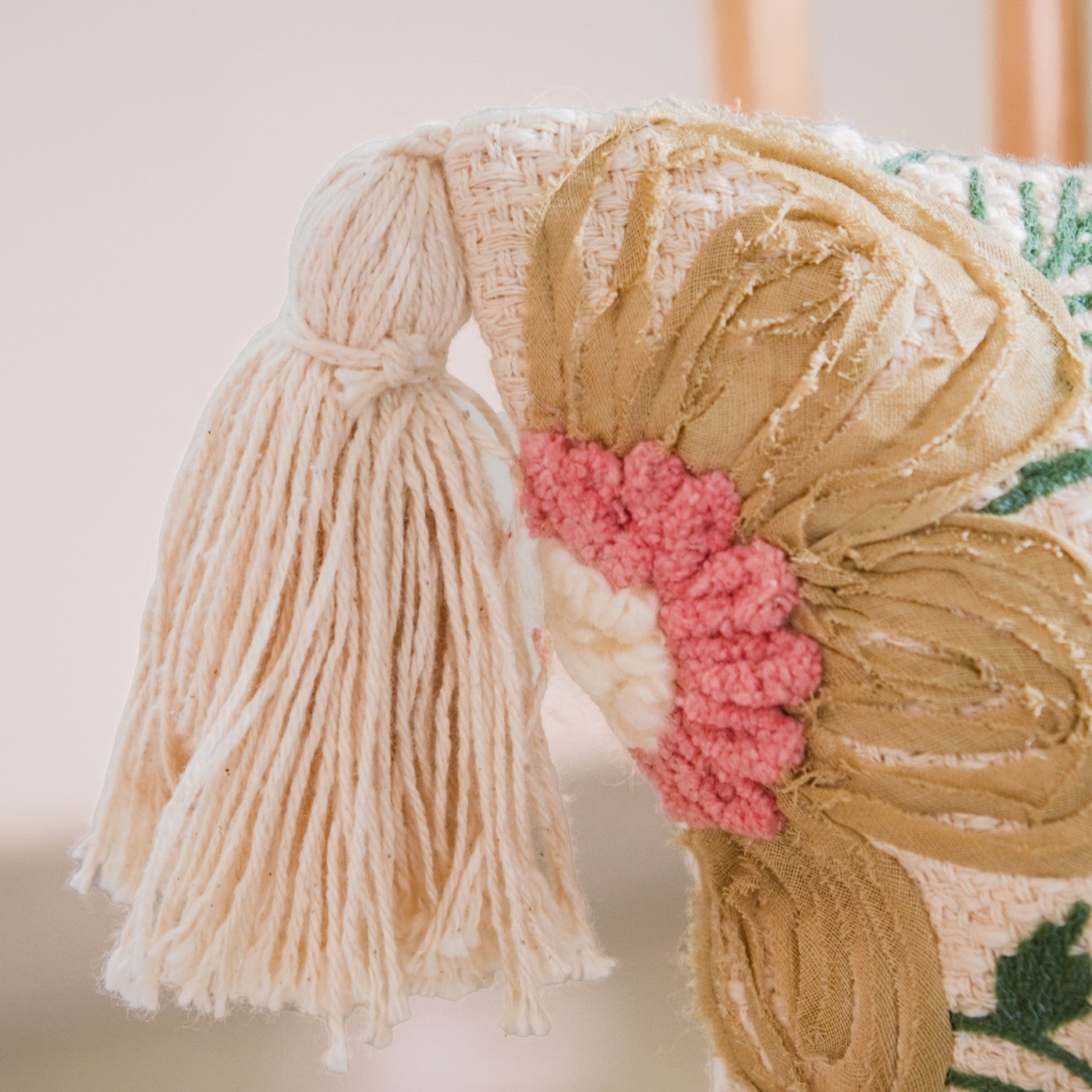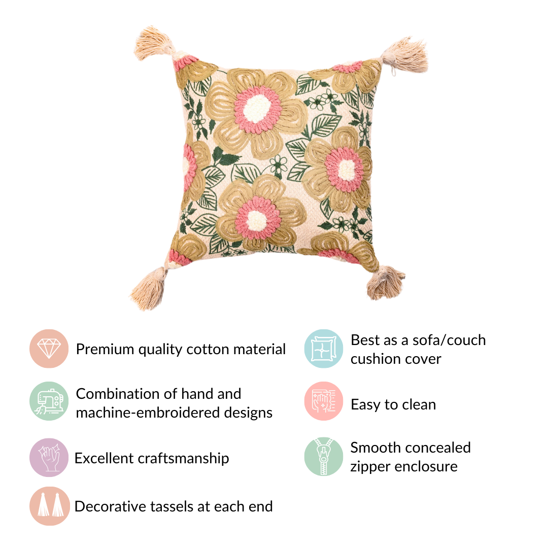 Revitalize your living area with a hint of charm using our lavish cushion cover. Featuring a marvellous fusion of intricately embroidered floral designs and leaves on a meticulous basket weave design, this pillowcase adds a touch of grandeur to your soft furnishing collection. The machine-crafted floral embroideries gracefully decorate the textured foundation, making it a captivating addition to your home decor. Effortless cushion insertion and removal are assured by the concealed zipper at the back, while the subtle addition of tassels at each end adds a dash of sophistication. To safeguard the enduring beauty of the detailed embroideries, we recommend dry cleaning the pillowcase to preserve its exquisite appeal for years to come.