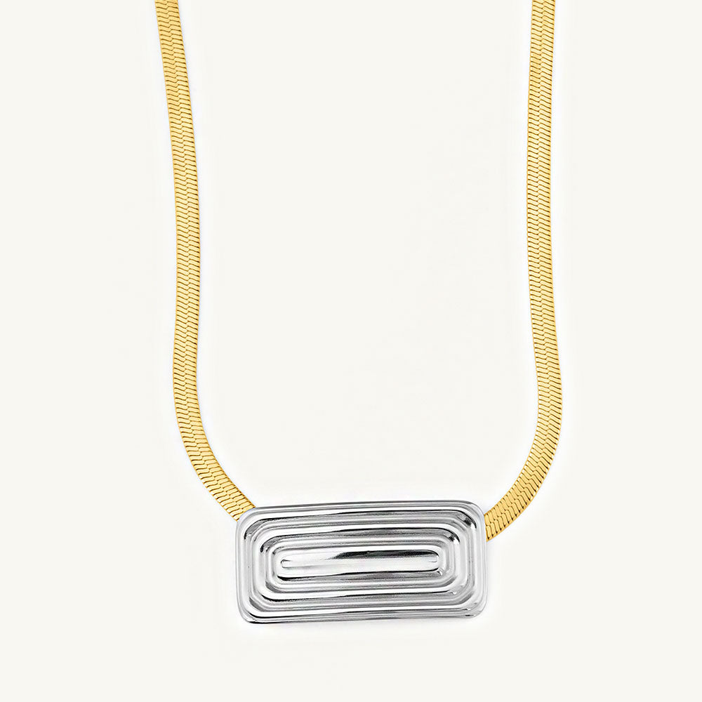 The Ridged Pendant Necklace is a striking jewellery piece featuring a textured ridged pendant on a dual-tone gold-plated stainless steel chain. Its contemporary design adds dimension and subtle statement to any outfit. Perfect for layering or wearing solo, this short necklace elevates casual, office, and evening ensembles with modern sophistication and refined charm.