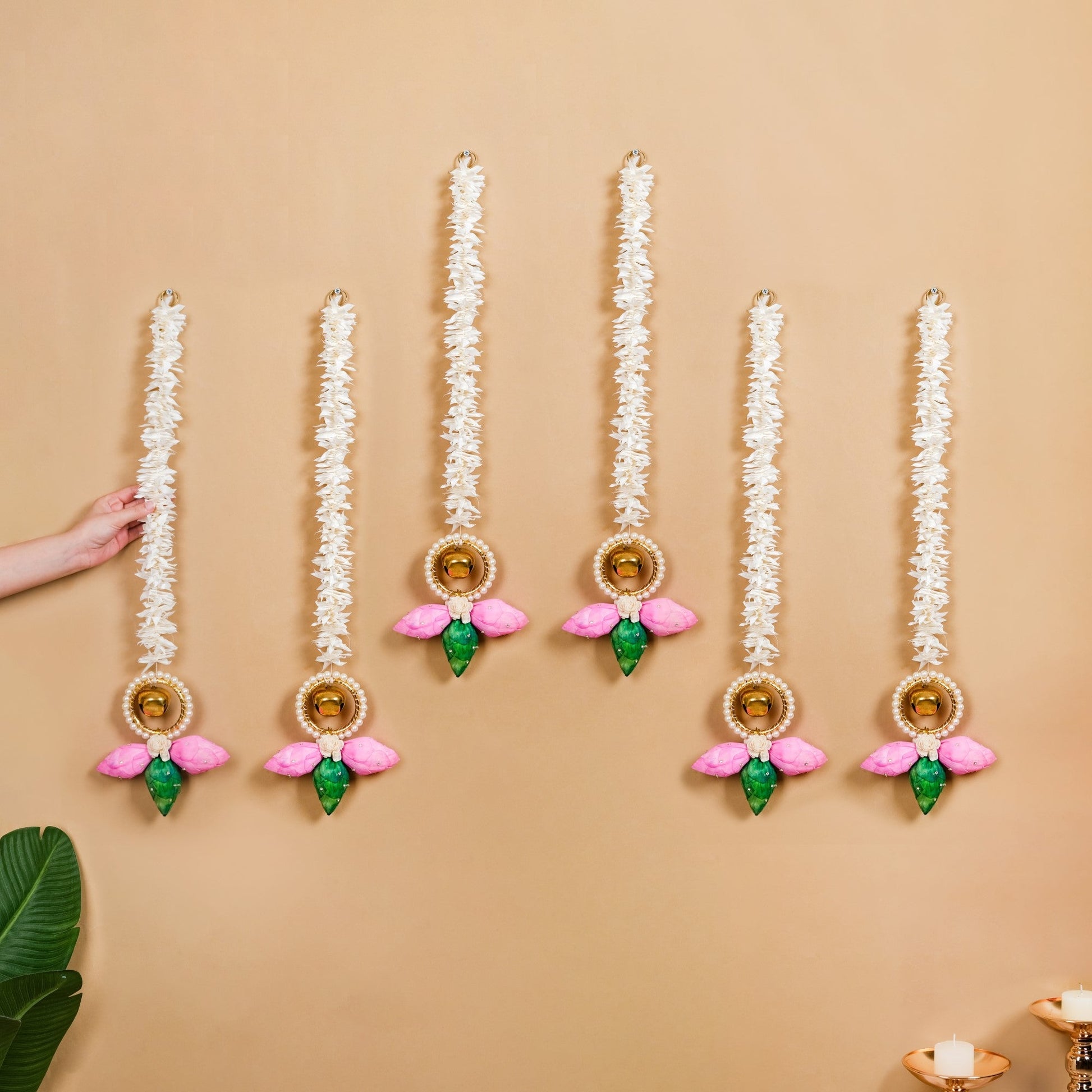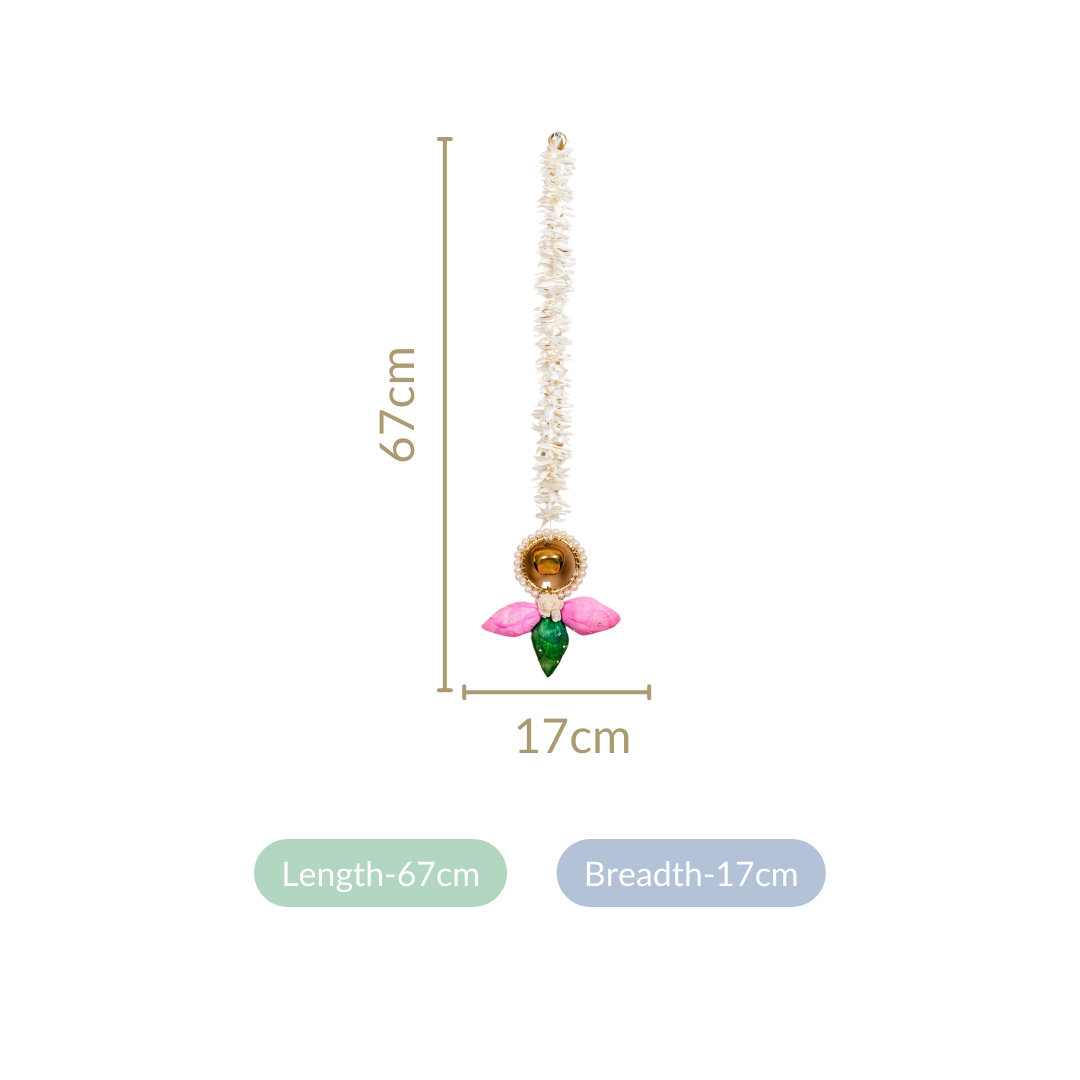 Benefits: The wall hangings are meticulously handcrafted from durable materials with exquisite Gota Patti work and artificial pearls, ensuring longevity and luxury. These decorative pieces include dried sola pith flowers for the natural charm and a delicate metal bell for a subtle ambience. The decor hangings add elegance and sophistication to any room decor effortlessly.