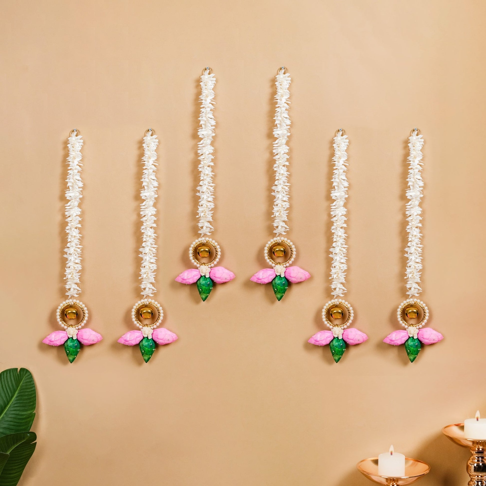 Design: Each wall decor piece features a top metal loop for easy hanging and is adorned with Gota Patti work, artificial pearls, dried sola pith flowers, 3 lotus buds, and a small rose for intricate detailing.