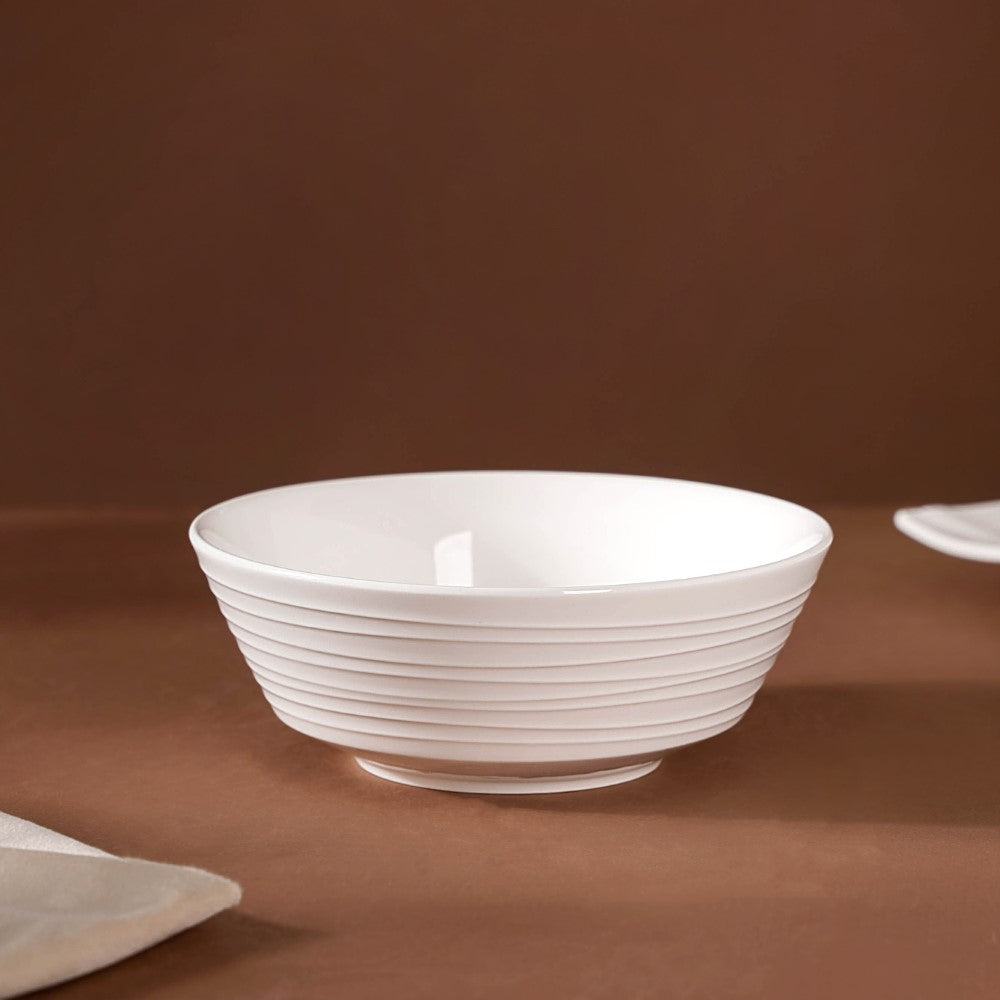 The white ceramic serving bowl has unique rib patterns adorning its outer surface. The ceramic bowl is designed to make the meals served in it appear better. Curries, rice, soups, lentils, and a variety of other dishes can all be served in the ceramic serving bowl. Fresh-cut fruits and salads can also be served in the serving bowl.