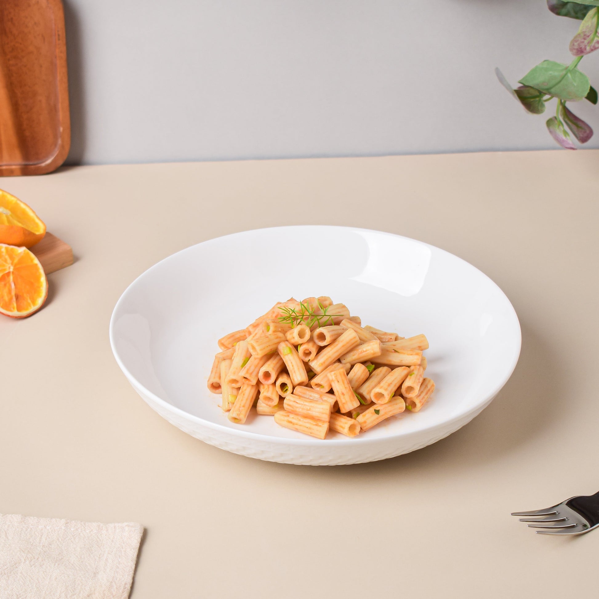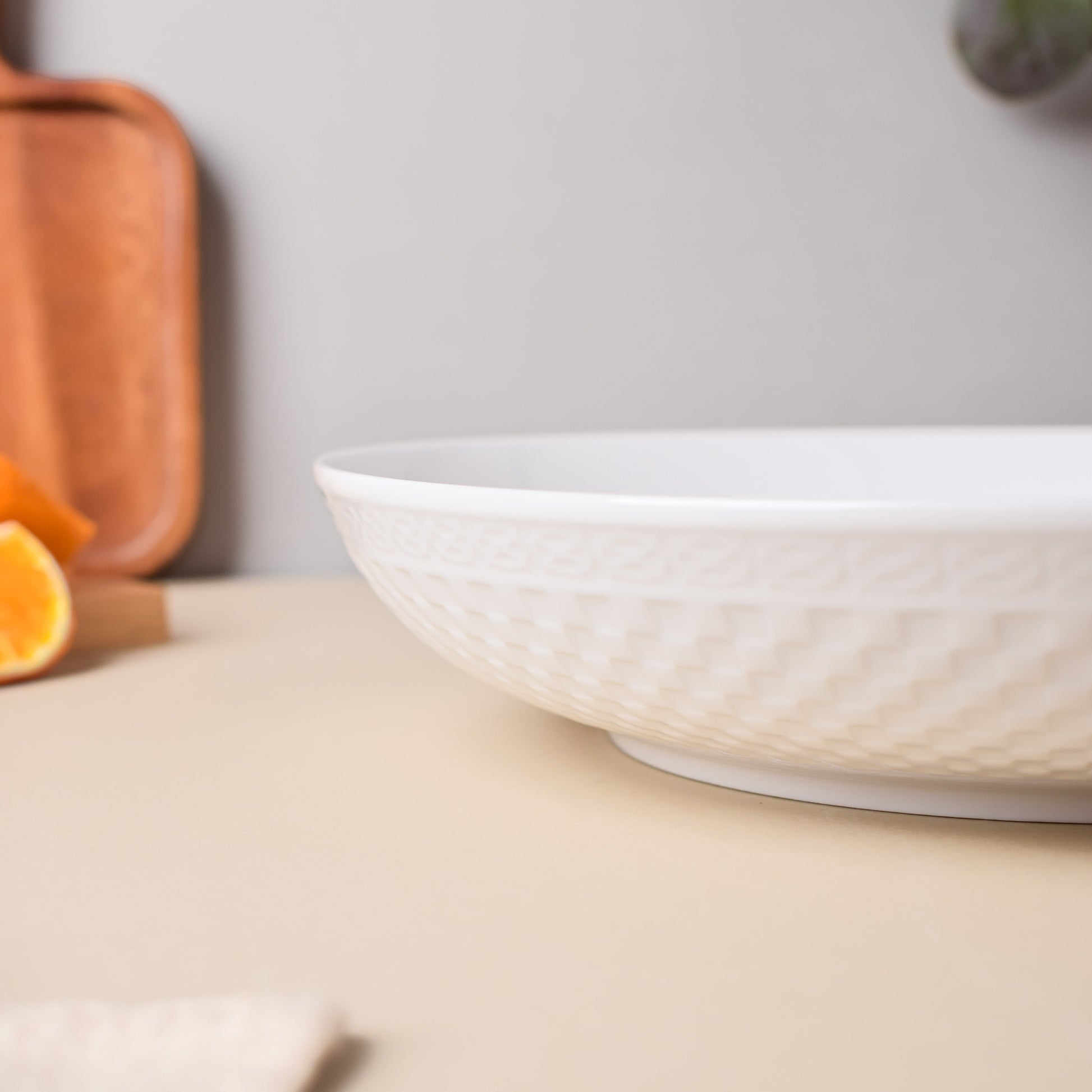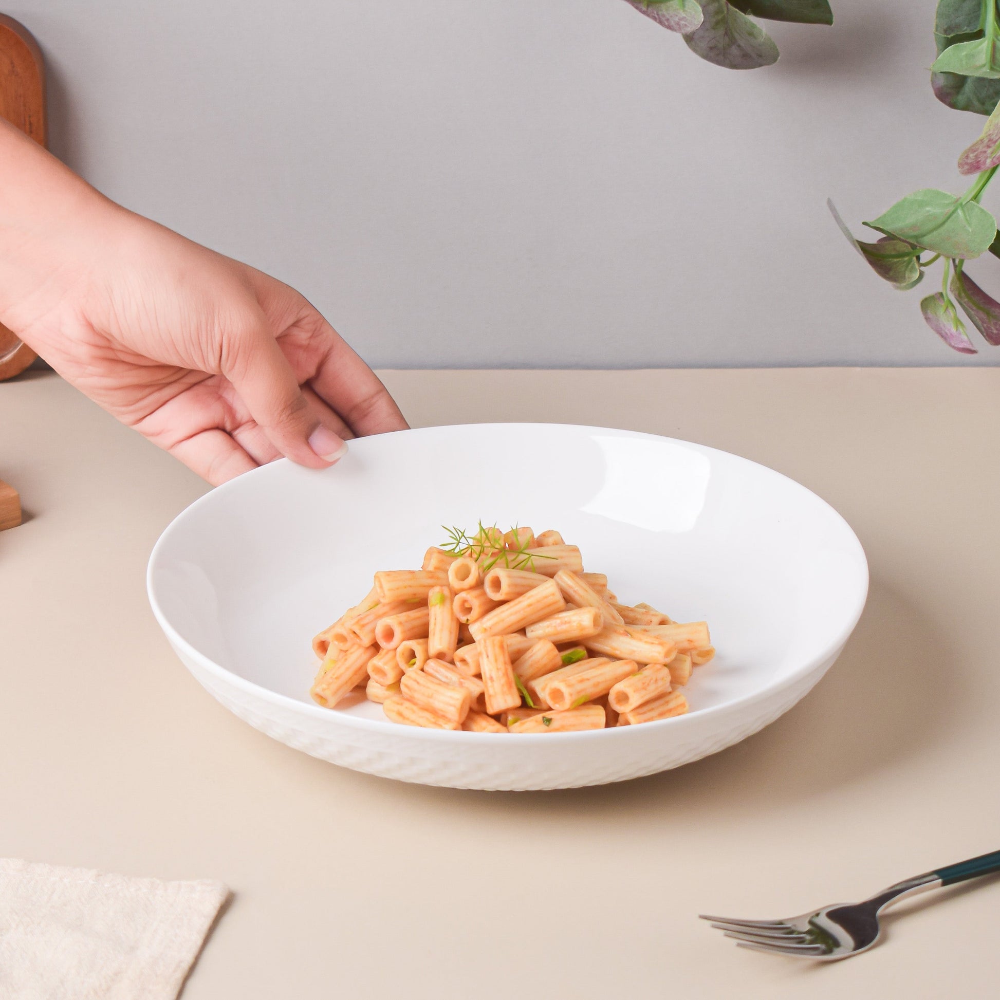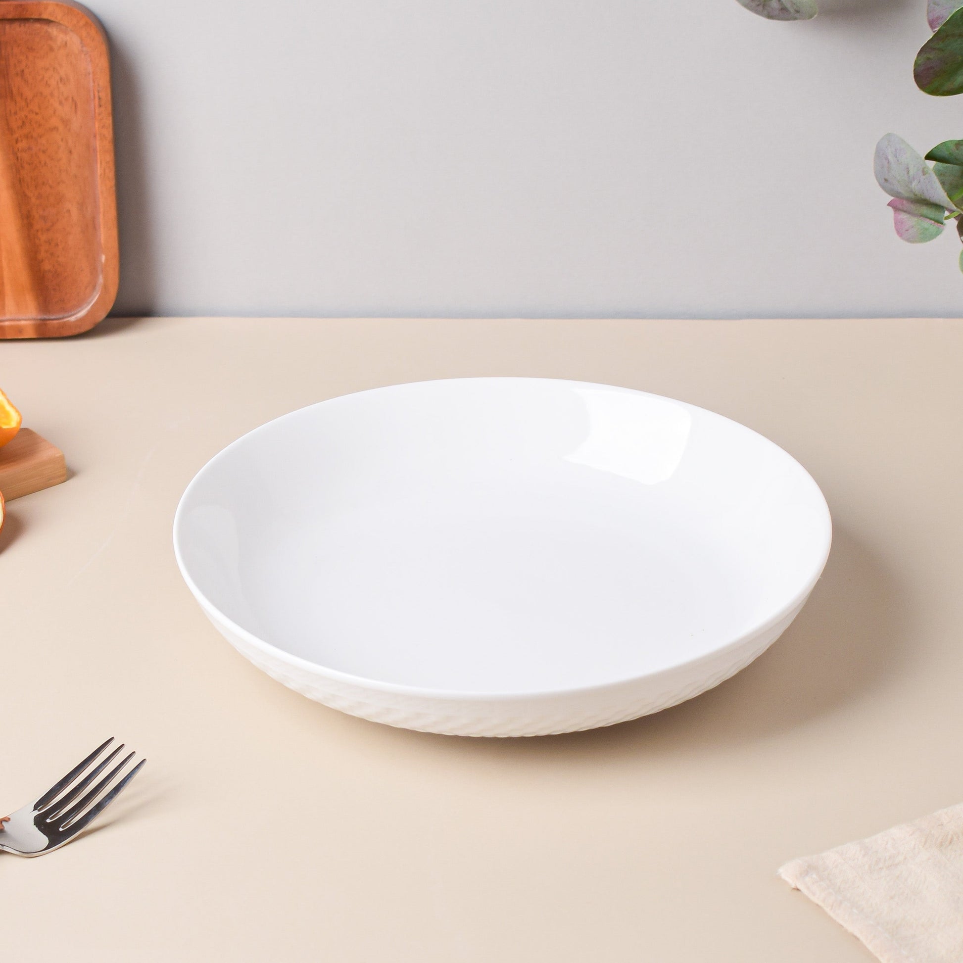 The white deep dish elevates the look of the delicacies served in it and also adds a touch of refinement to any neutral table setting. Unique textures adorn the exterior surface of the ceramic deep dish. Serve rice, noodles, or pasta in the exotic deep dish to dazzle guests or family members at social occasions or get-togethers.