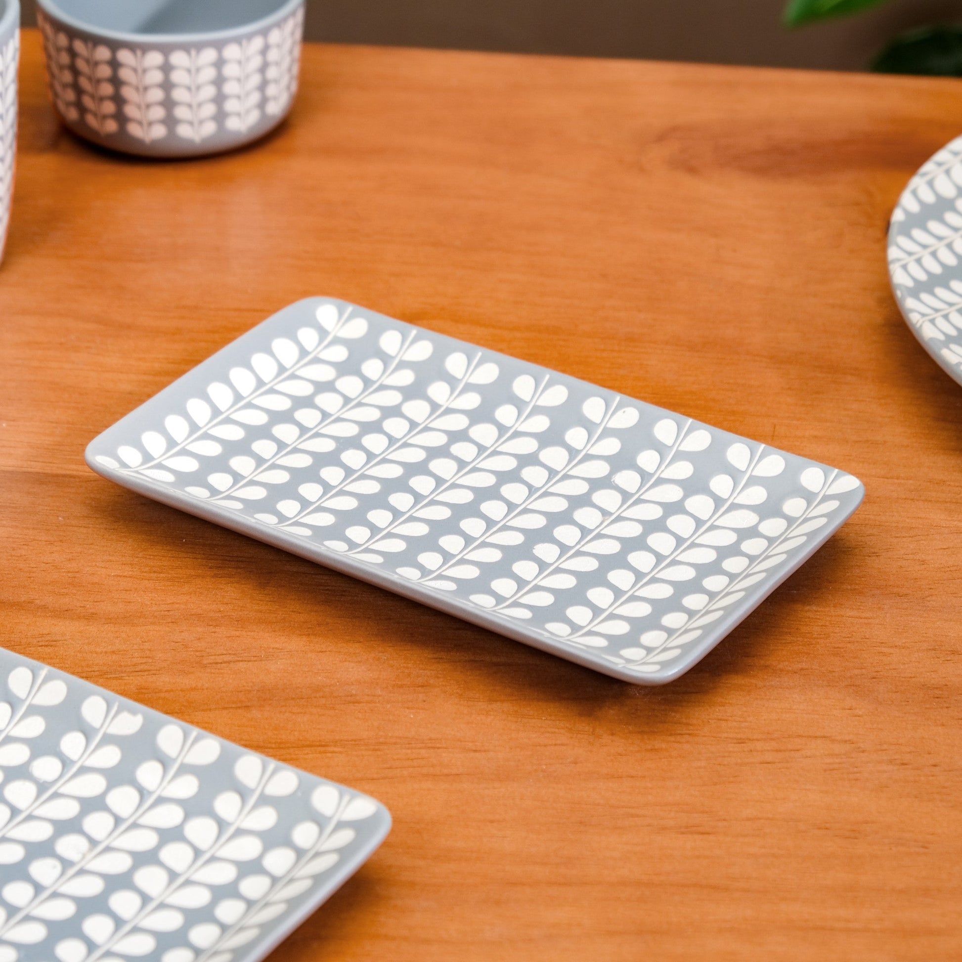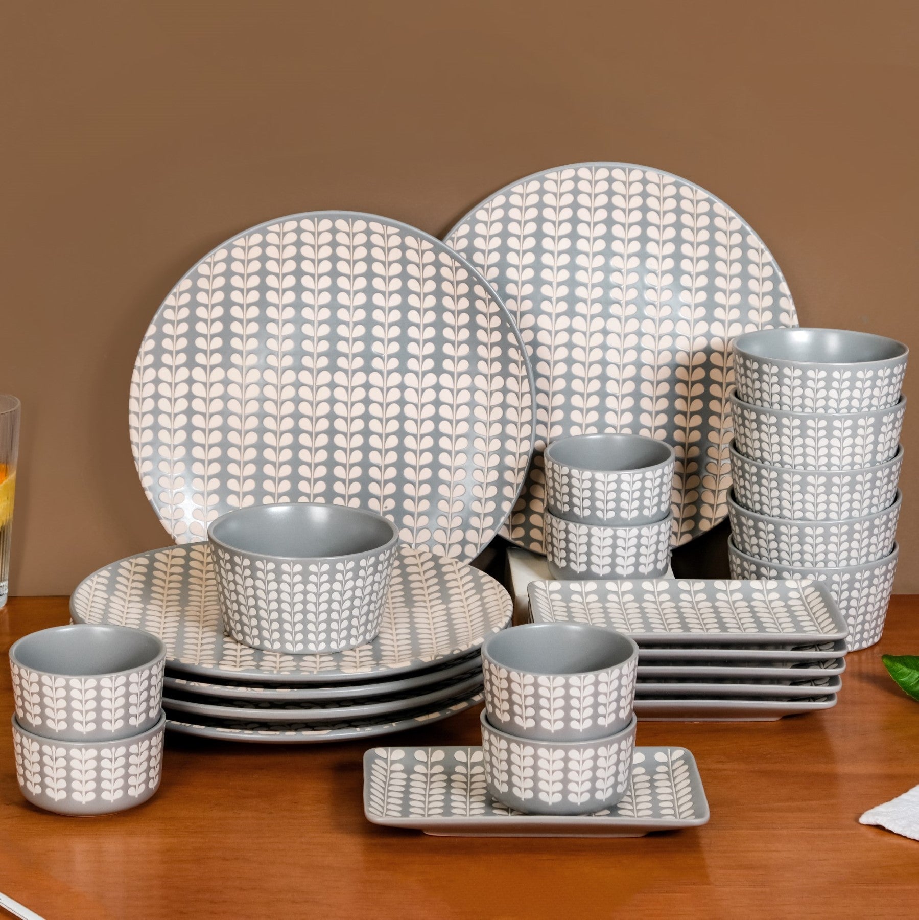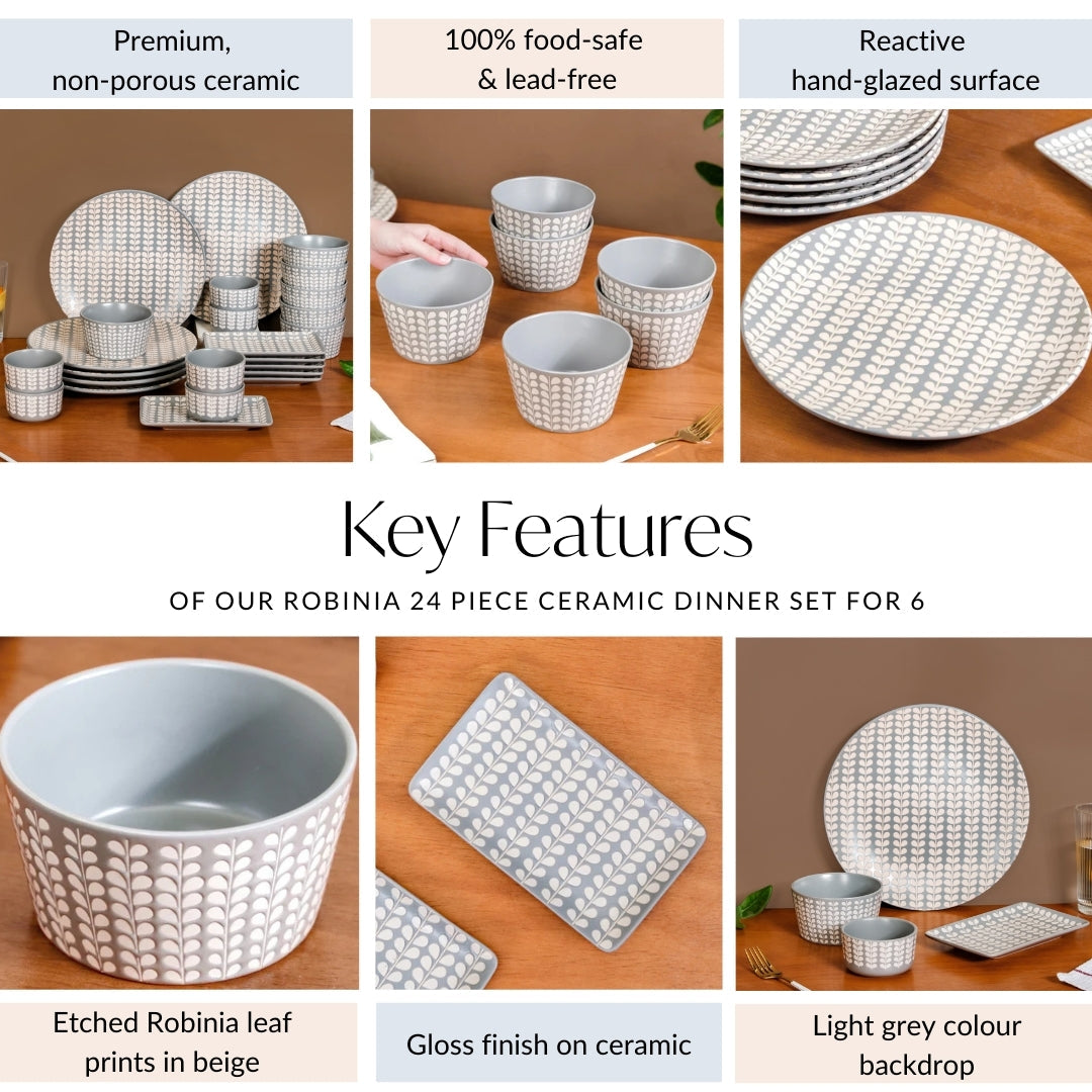 Design: The dinnerware set features intricate etched prints of Robinia leaves in beige, bringing a refined, organic touch to each piece. The soft, light grey backdrop enhances the natural elegance, while the glossy finish adds a sleek, polished appearance. The subtle yet sophisticated design blends modern aesthetics with nature's beauty, making it the perfect complement to various table settings and decor themes.