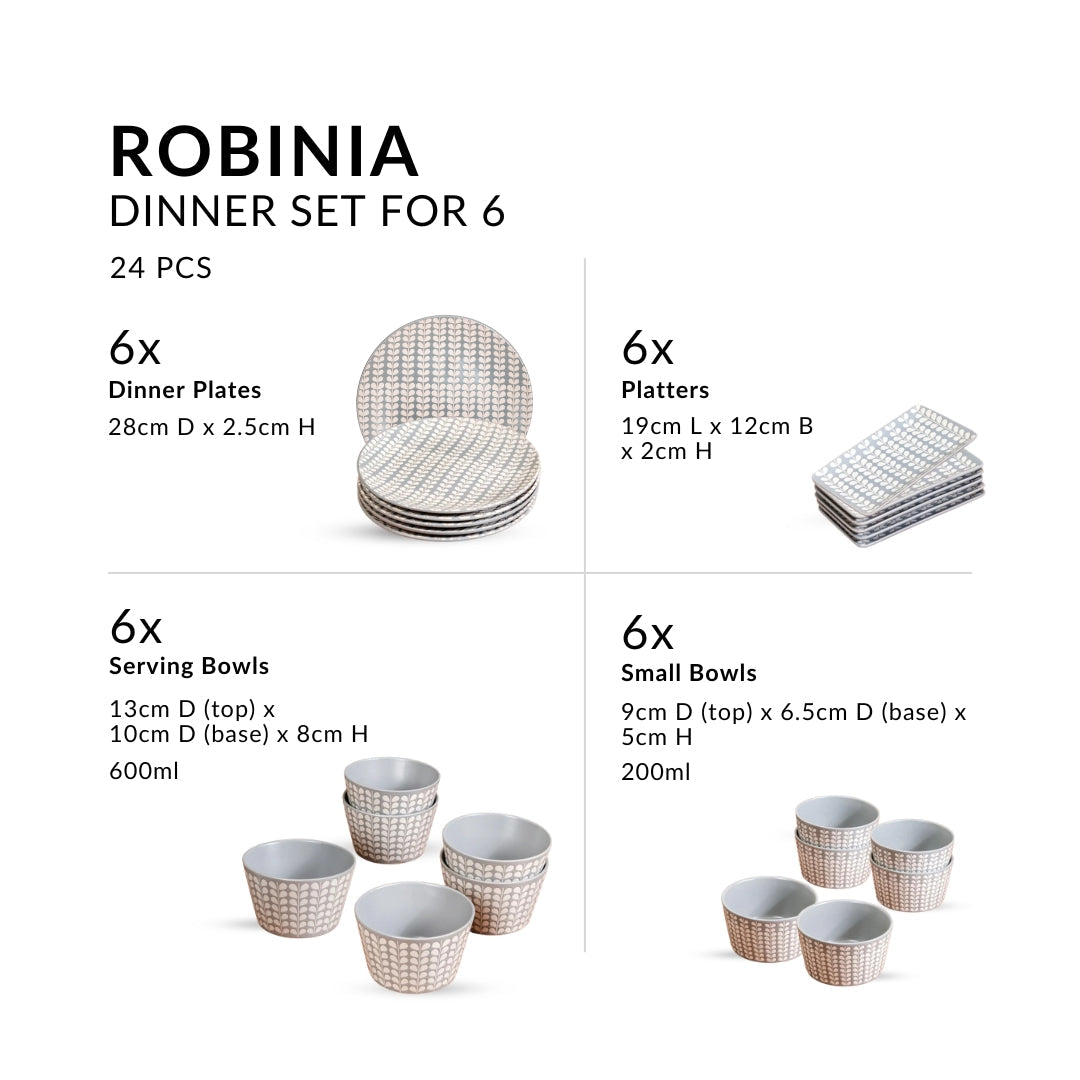 Elevate your dining experience with the 24-piece Robinia ceramic dinner set, a harmonious blend of nature-inspired design and functional elegance. Perfect for serving up to 6 guests, this set includes 6 dinner plates, 6 serving platters, 6 snack bowls, and 6 small bowls, ensuring your meals are beautifully presented.
