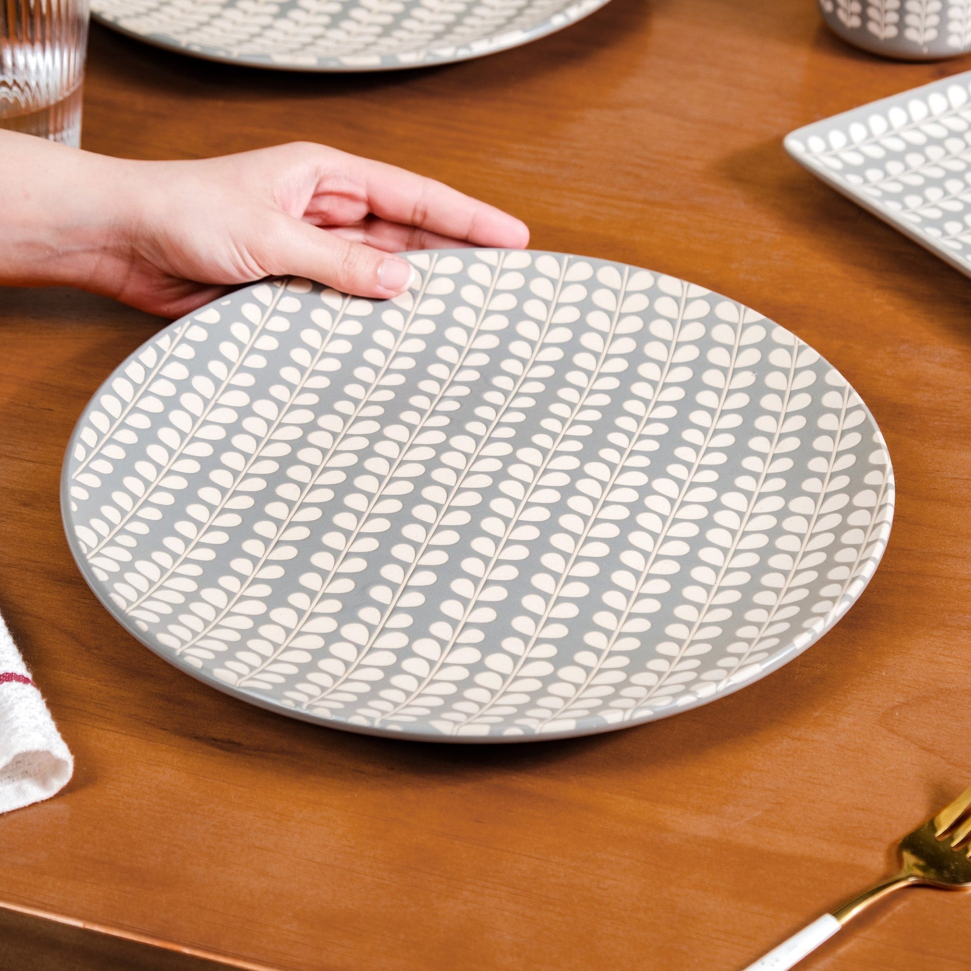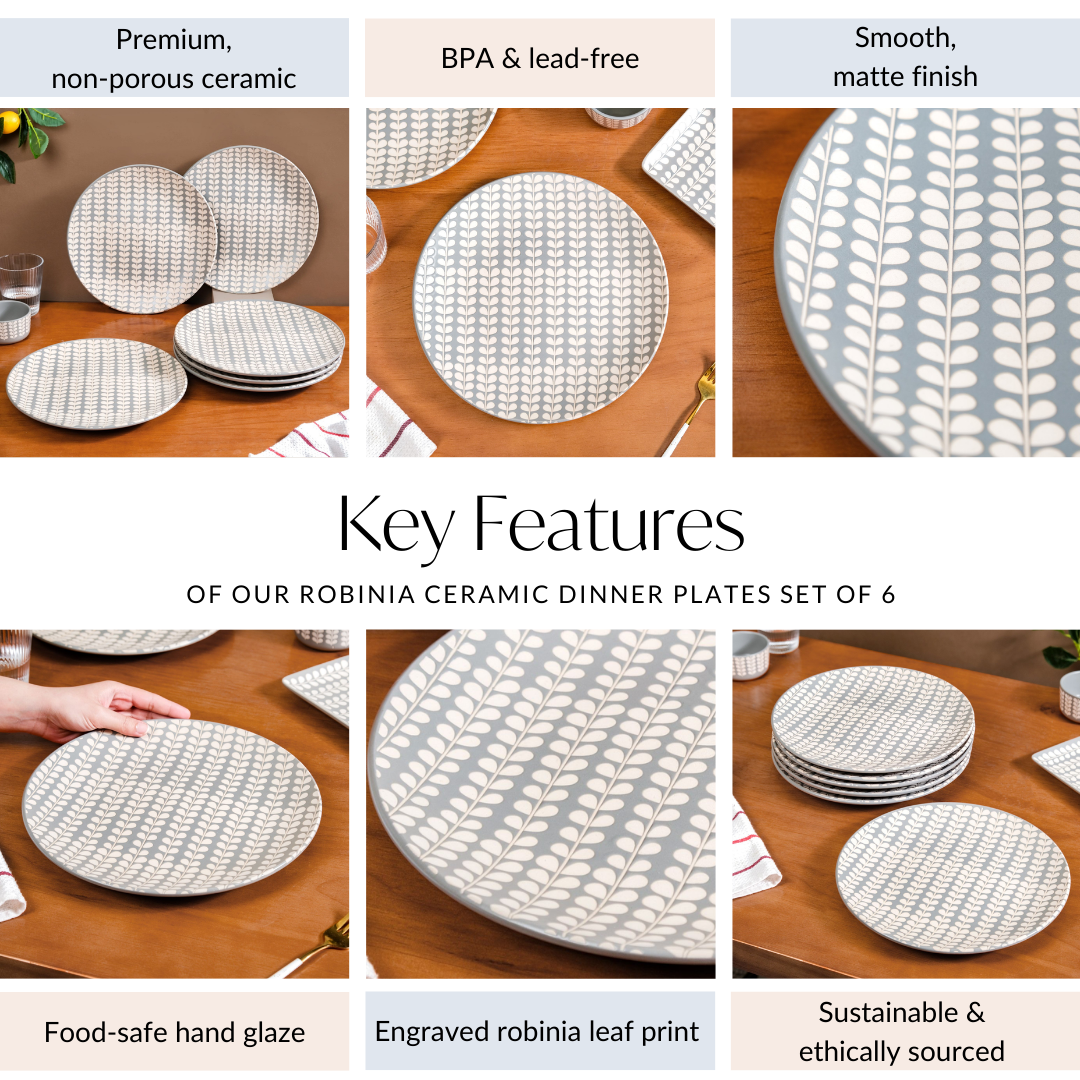 Design: Designed to showcase our craftsmen's artistry, each dinner plate boasts a rich light grey, exuding a minimalistic charm that adds sophistication to any table setting. The all-over pattern of robinia leaves that has been meticulously engraved onto each dinner plate in a soothing beige shade adds a certain je ne sais quoi that elevates the aesthetic appeal. The wide, smoothly rounded edge ensures that each dish is presented beautifully while offering ample space for your culinary creations.