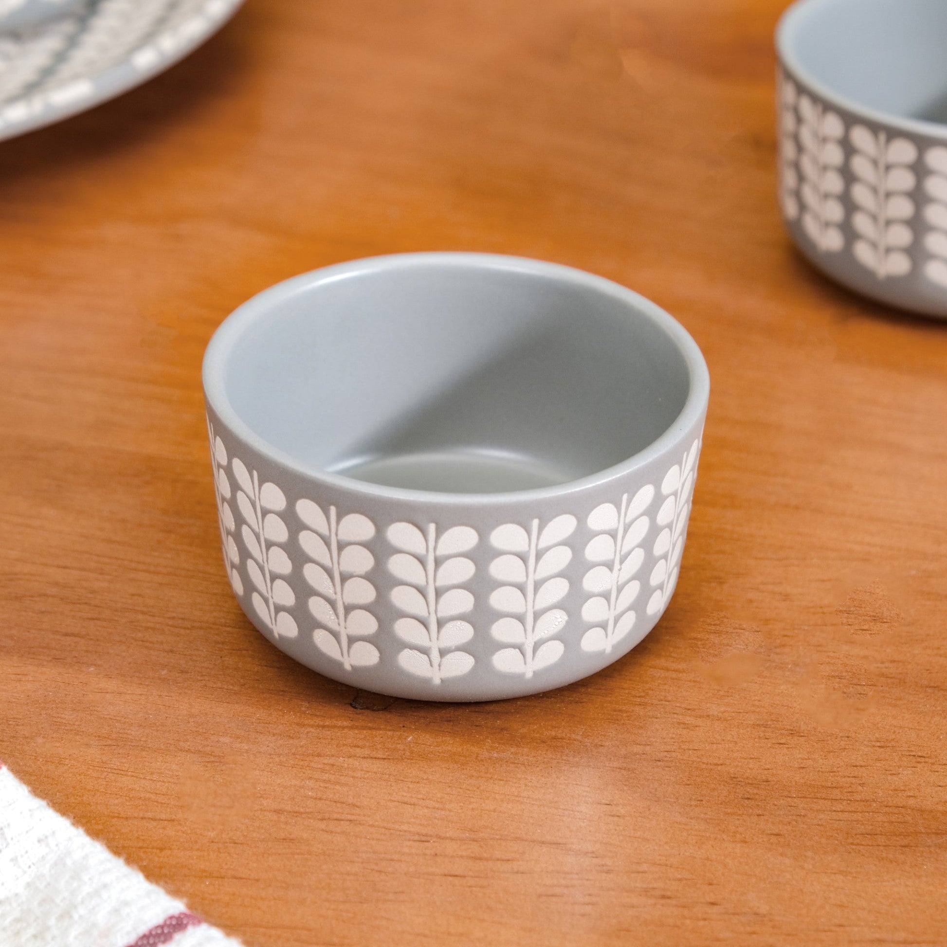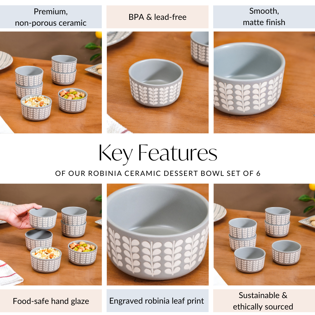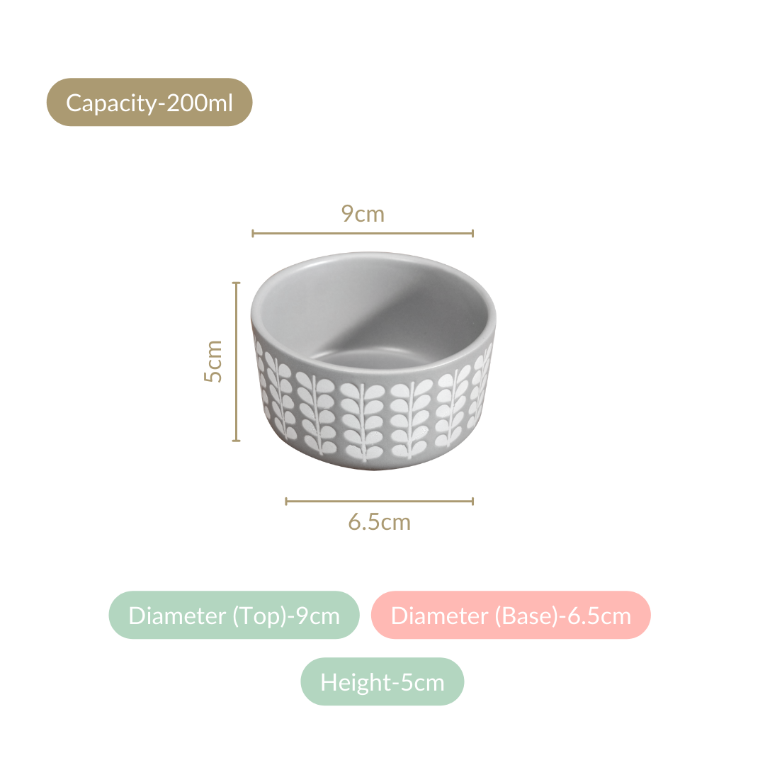 Design: Meticulously designed, each ceramic bowl features a warm, ashy light grey colour that is beautifully complemented by a delicate robinia leaf pattern in a soft beige hue. This timeless design is both stylish and practical, making it a lovely addition to your tableware collection. The bowl’s wide, gently rounded shape ensures easy handling and serving, making it perfect for various snacks and side dishes.
