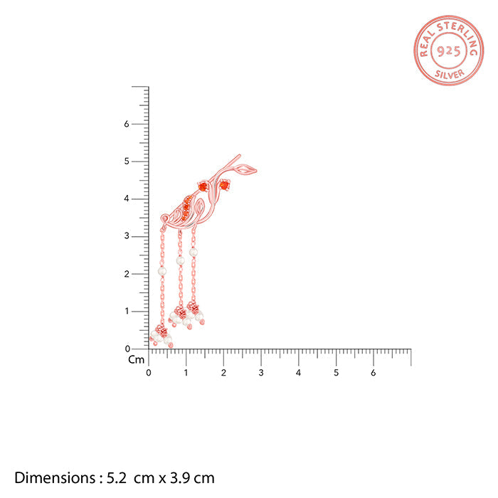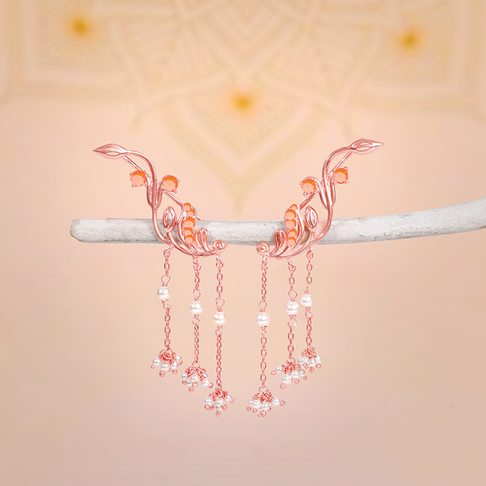 These rose gold earrings for women feature a leaf-inspired ear climber design accented with coloured stones, with cascading chains set with clusters of small pearls.