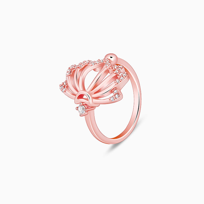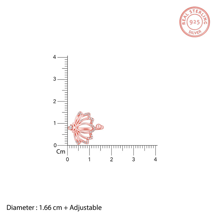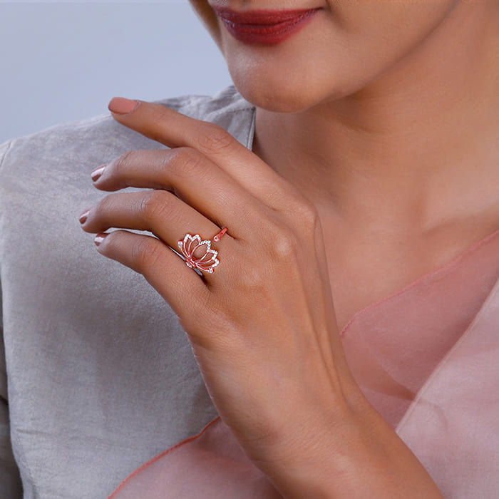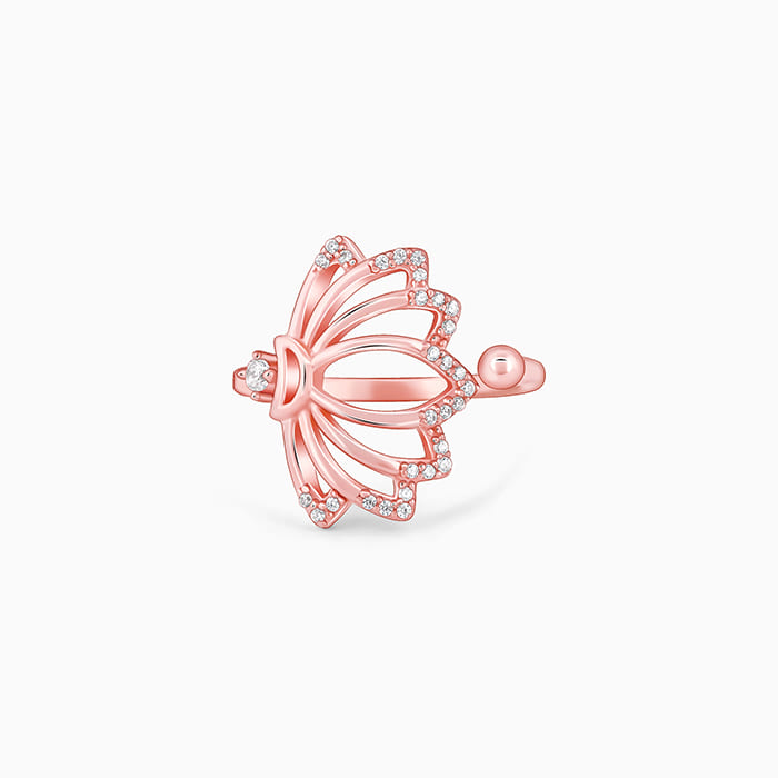 This rose gold ring features a lotus motif studded with zircons. Celebrate the timeless beauty of Indian textiles with Trendy Freak's latest 'Magic of Tradition' collection. Wear and celebrate tradition, anytime.