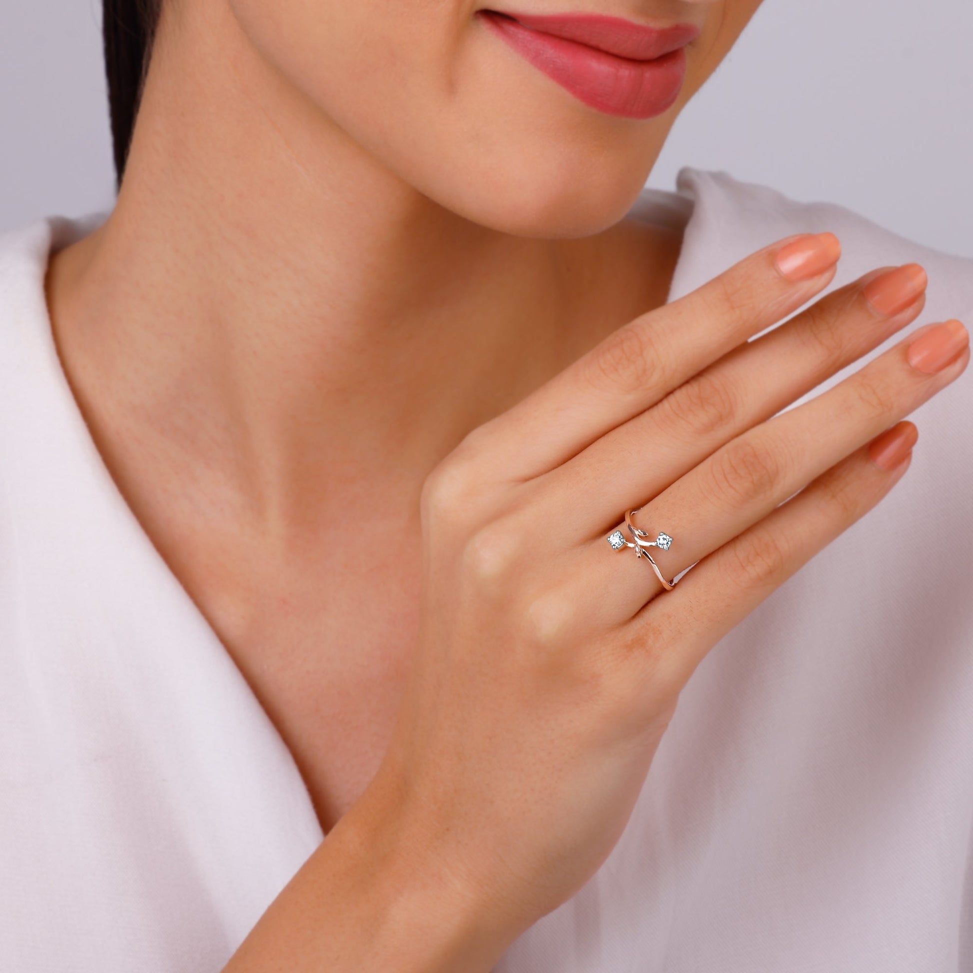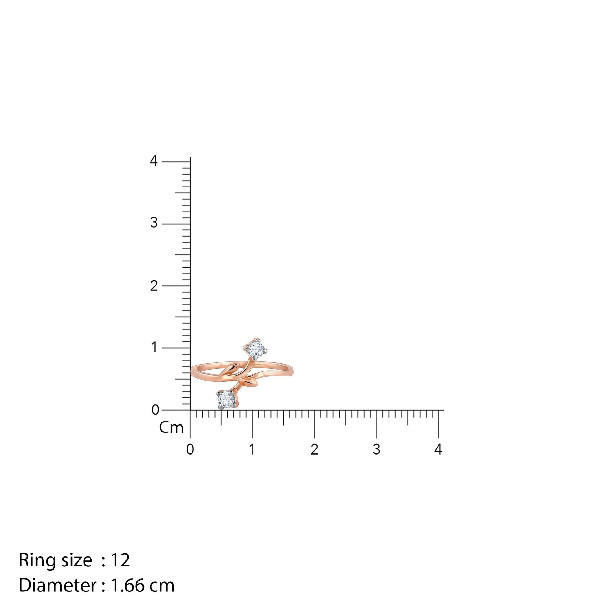 This pure rose gold ring features a dual flower motif, each with sparkling lab-grown diamonds and a delicate leaf design.