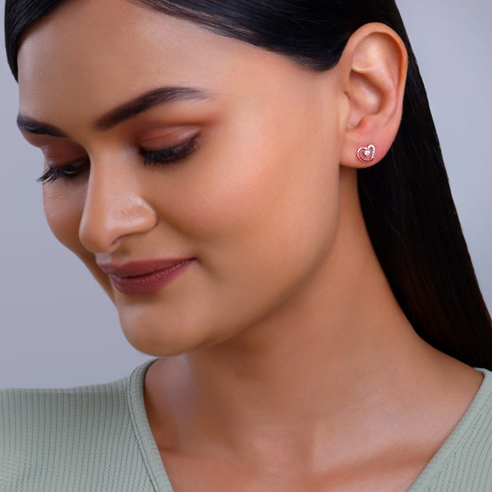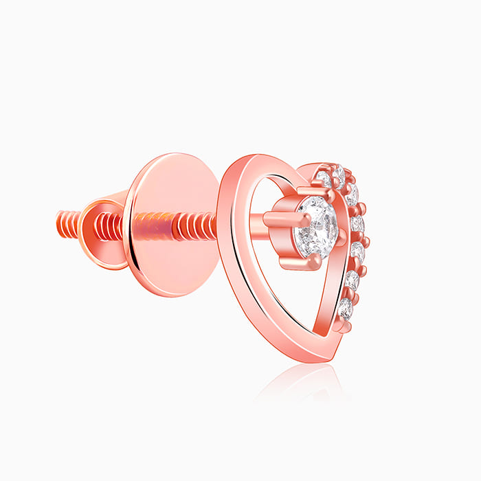 These rose gold earrings have a heart motif with zircon placed at the centre and studded around one side.