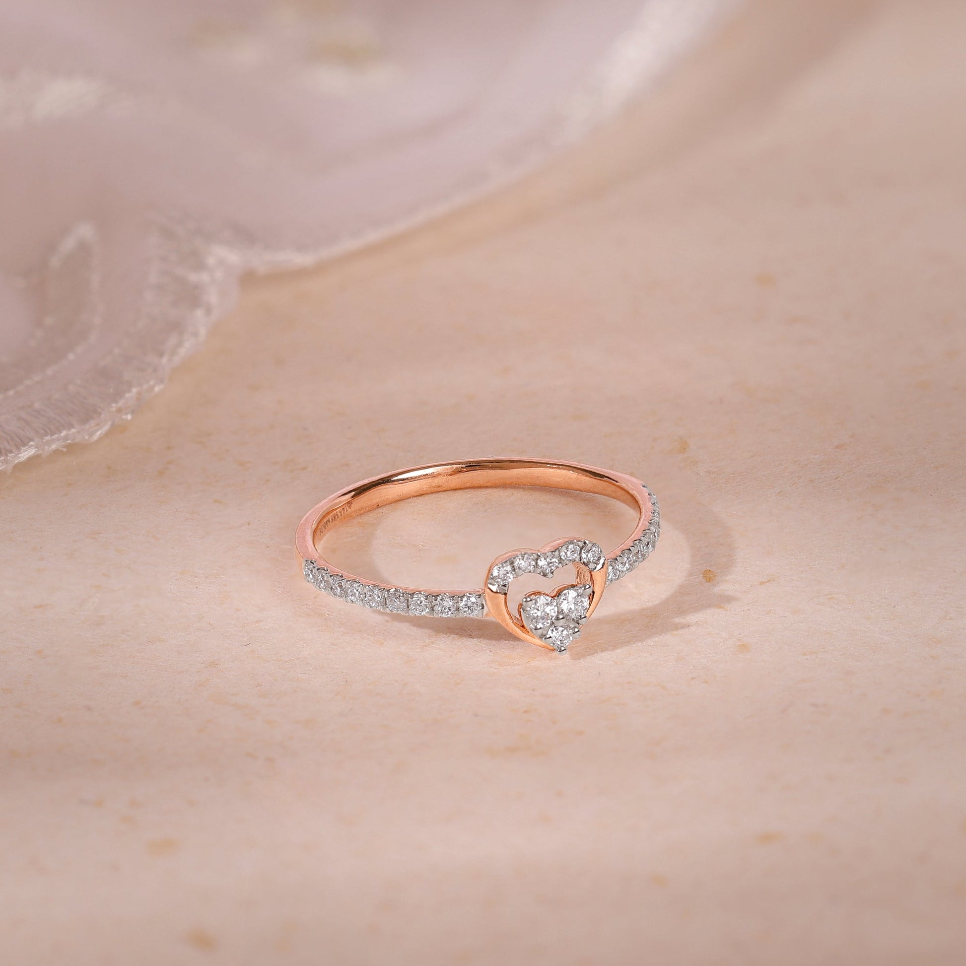 This pure rose gold ring for women features dual heart motifs. Each motif is beautifully studded with lab grown diamonds. The band is also encrusted with lab grown diamonds.