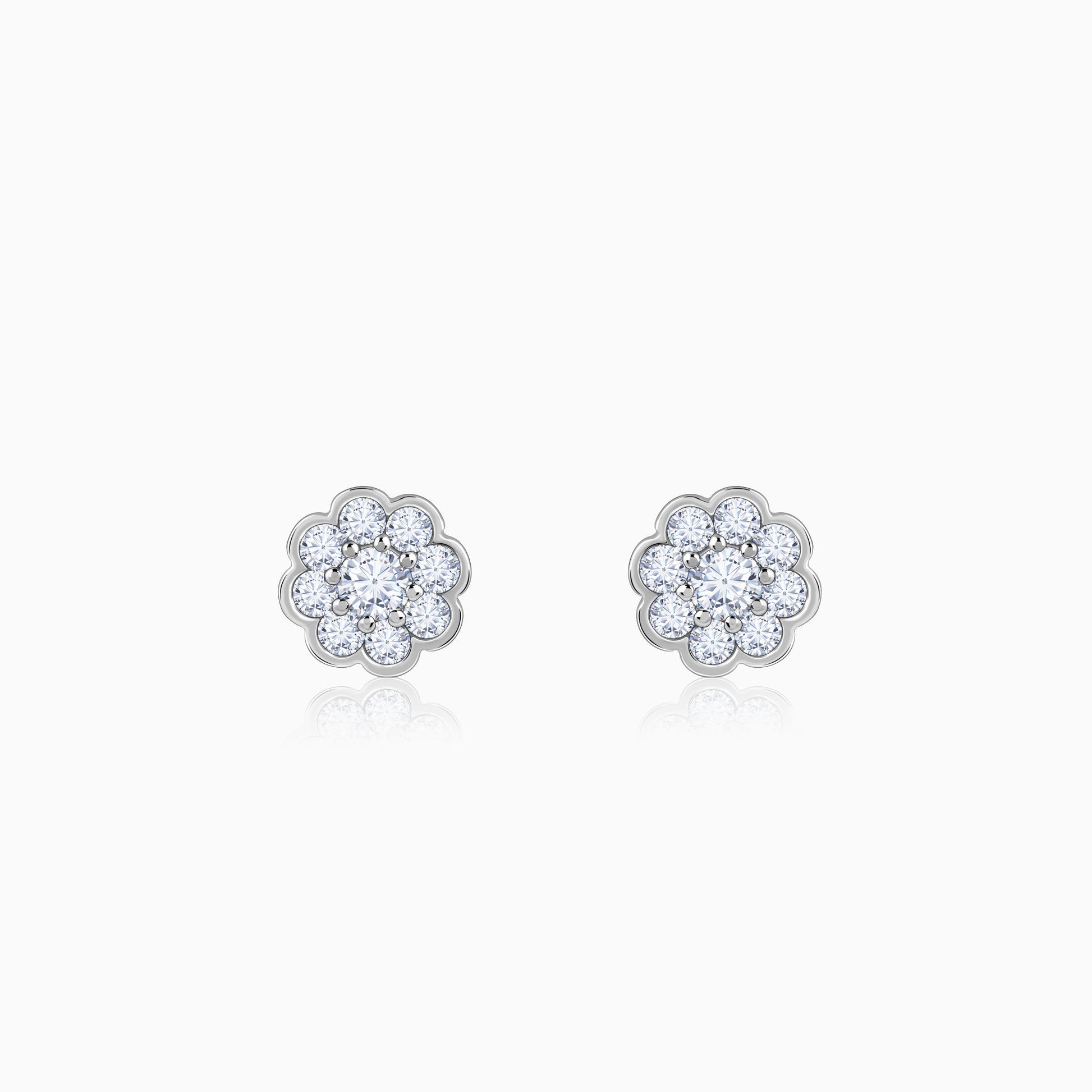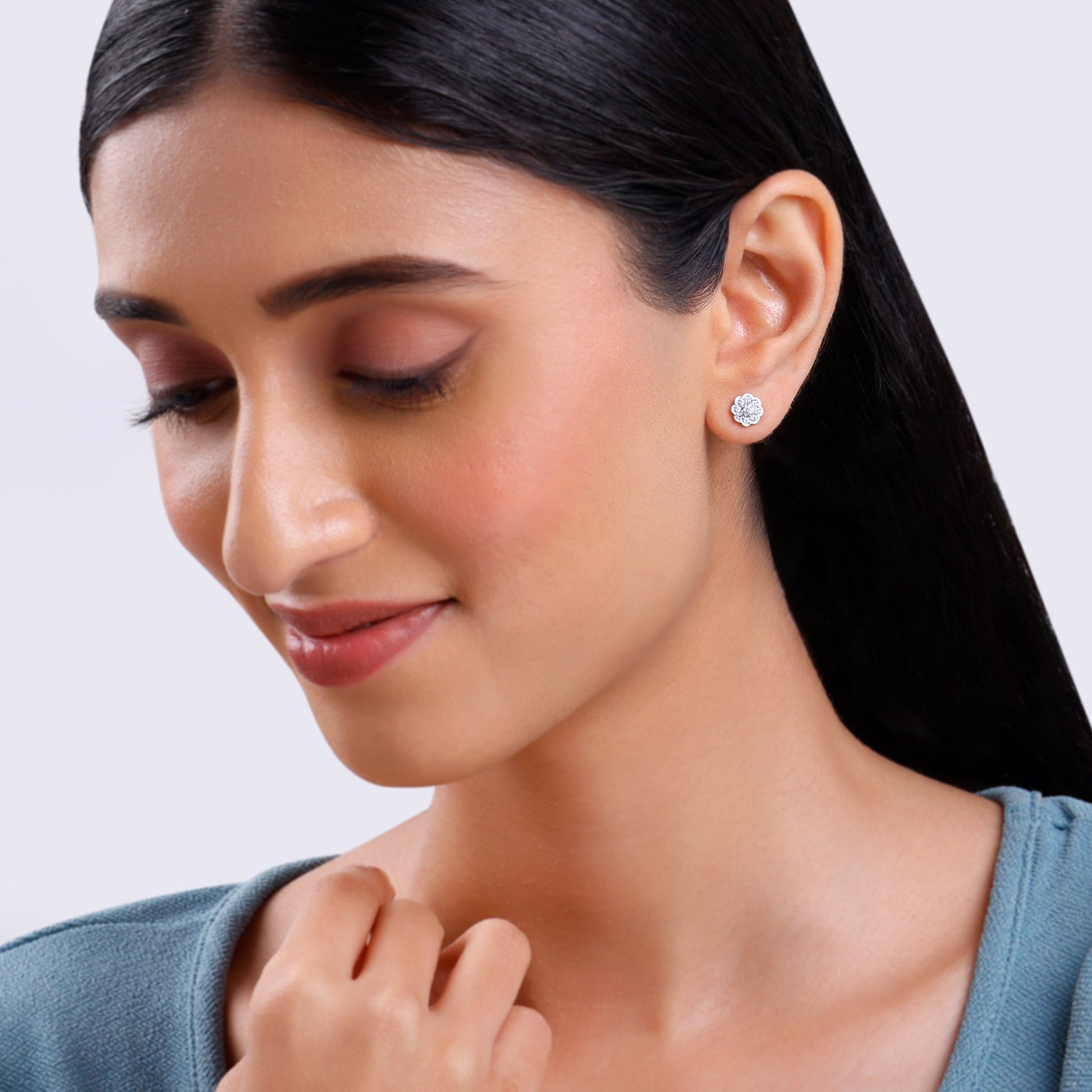 These pure rose gold earrings for women are studs that feature a minimal floral motif with a round-cut lab grown diamond at the centre. The petals surrounding the core also feature several round-cut lab diamonds.