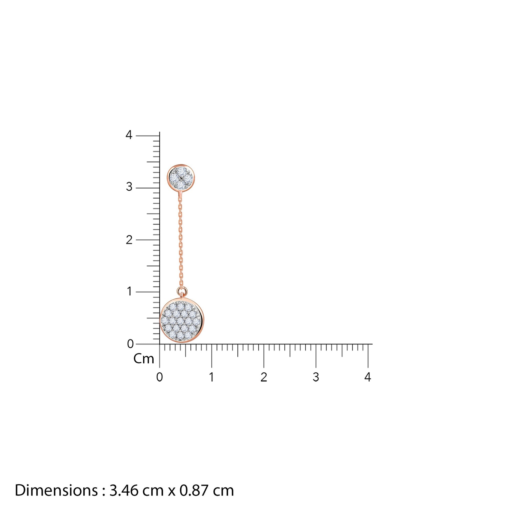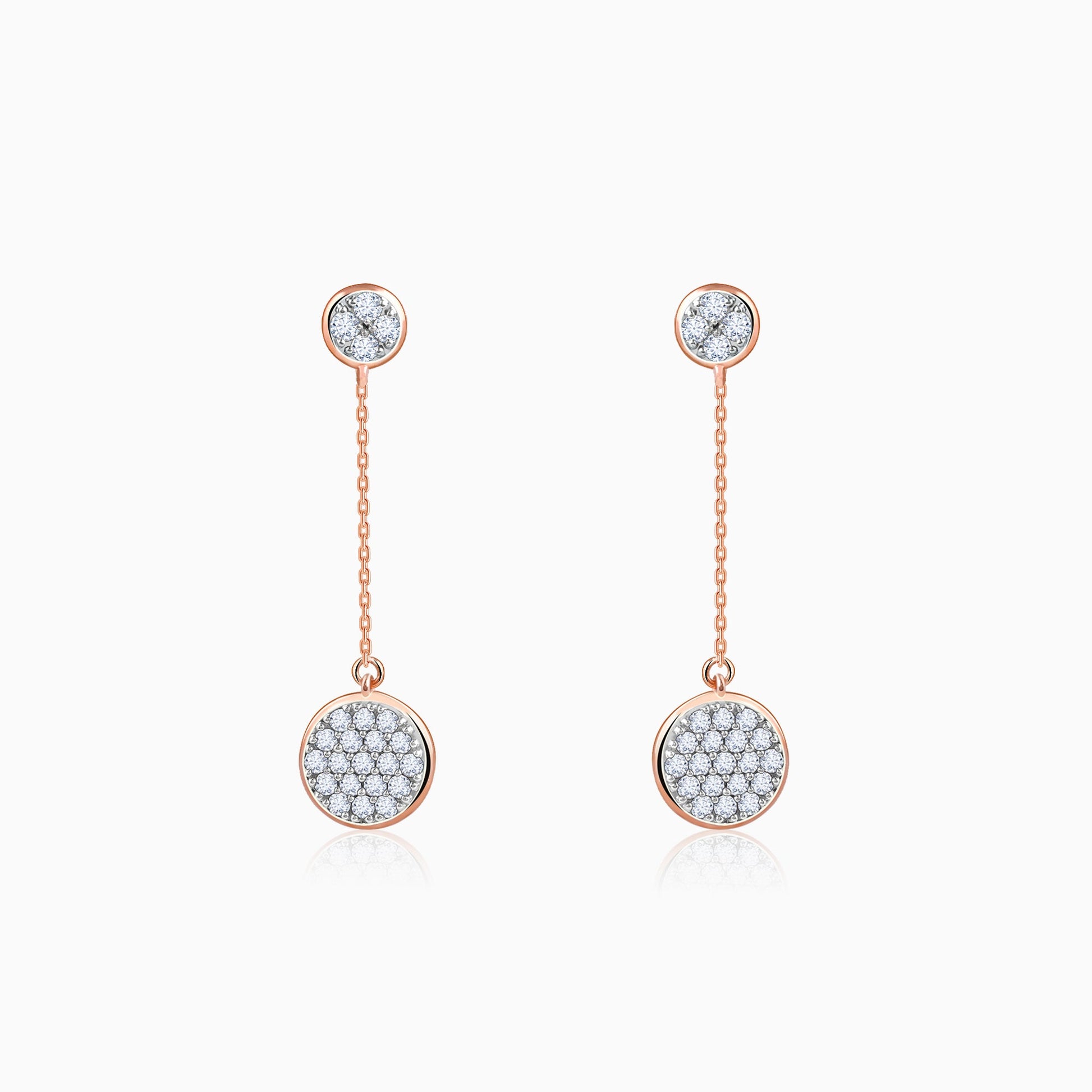 These pure rose gold earrings for women feature an upper dangle studded with a cluster of lab grown diamonds. Another circular motif studded with a cluster of lab diamonds dangles from a chain.