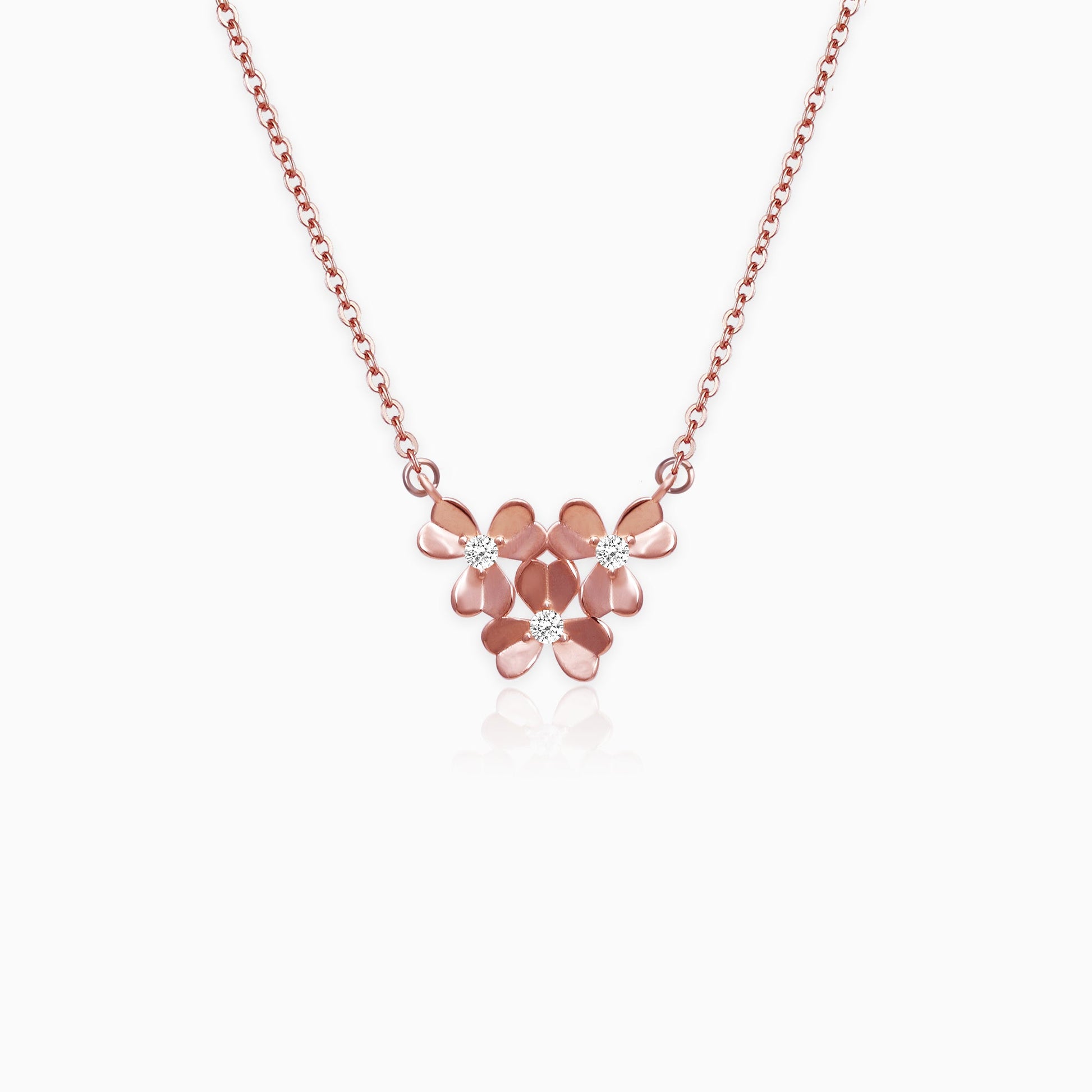 The rose gold pendant is shaped like a triangle with flowers forming the shape.