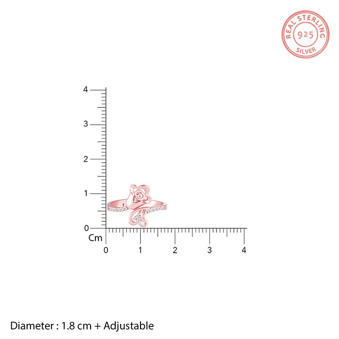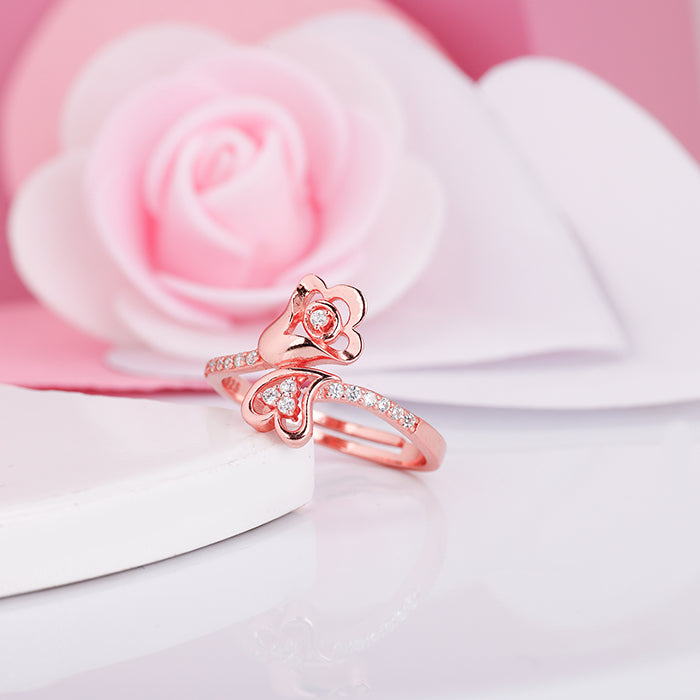 The rose gold ring is a zircon studded heart and blooming flower that crosses paths