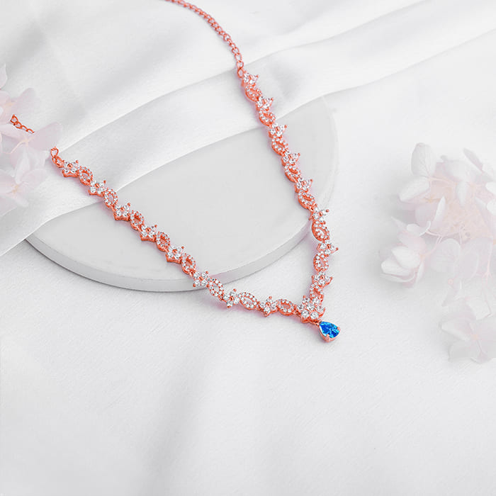 This rose gold necklace has an elegant design with studded zircons, and crystal blue-coloured stone at the centre.
