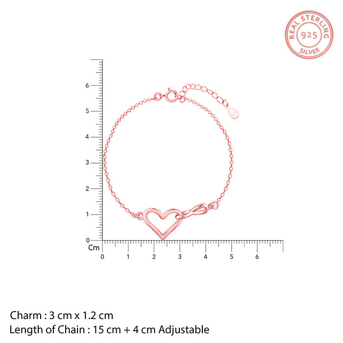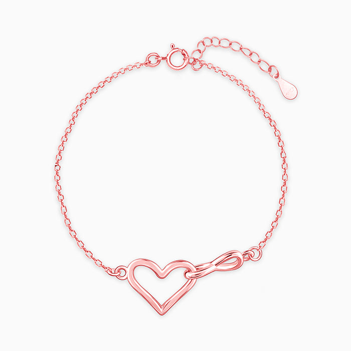 This rose gold plated bracelet for women features an open heart design. The heart is elegantly connected to an infinity symbol.