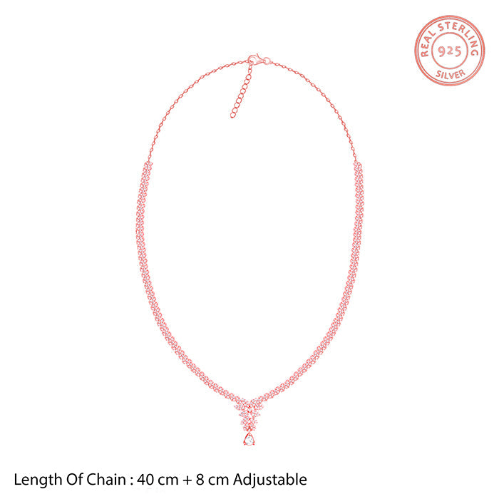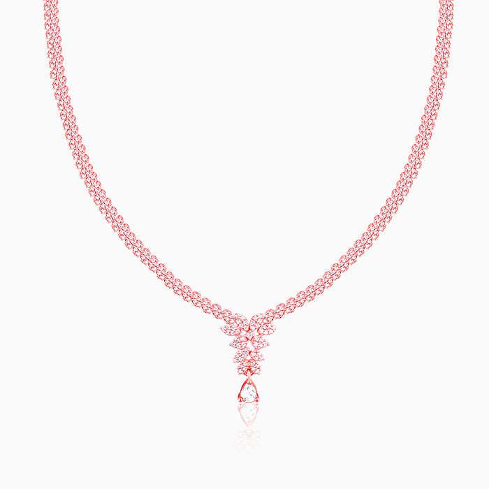 This rose gold necklace features an intricate design studded with zircons, with a zircon in a droplet design dangling below.