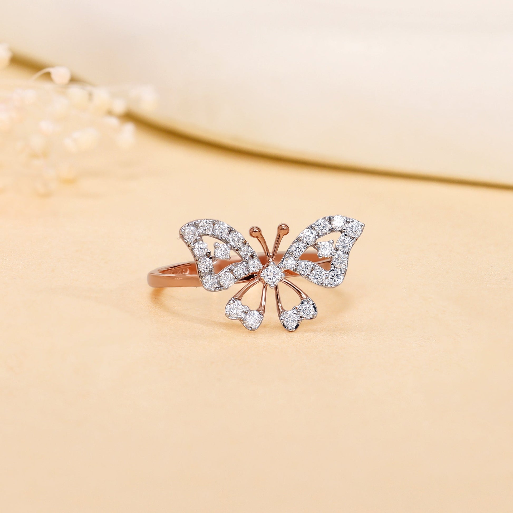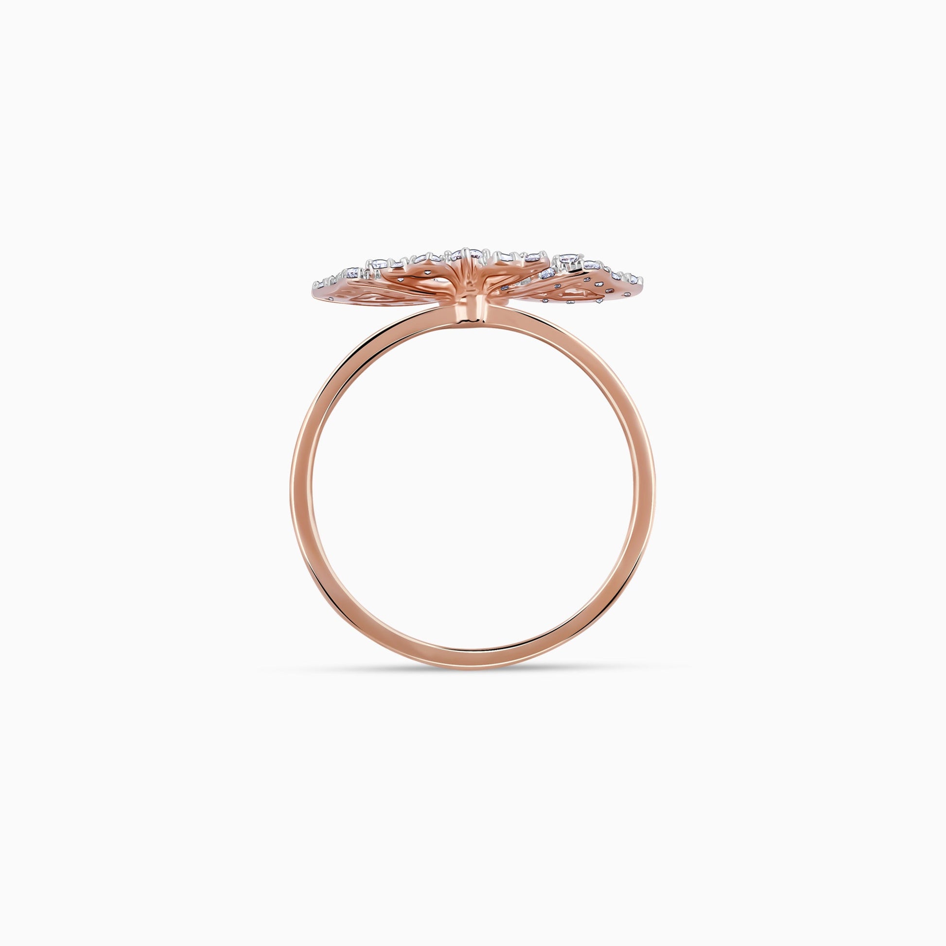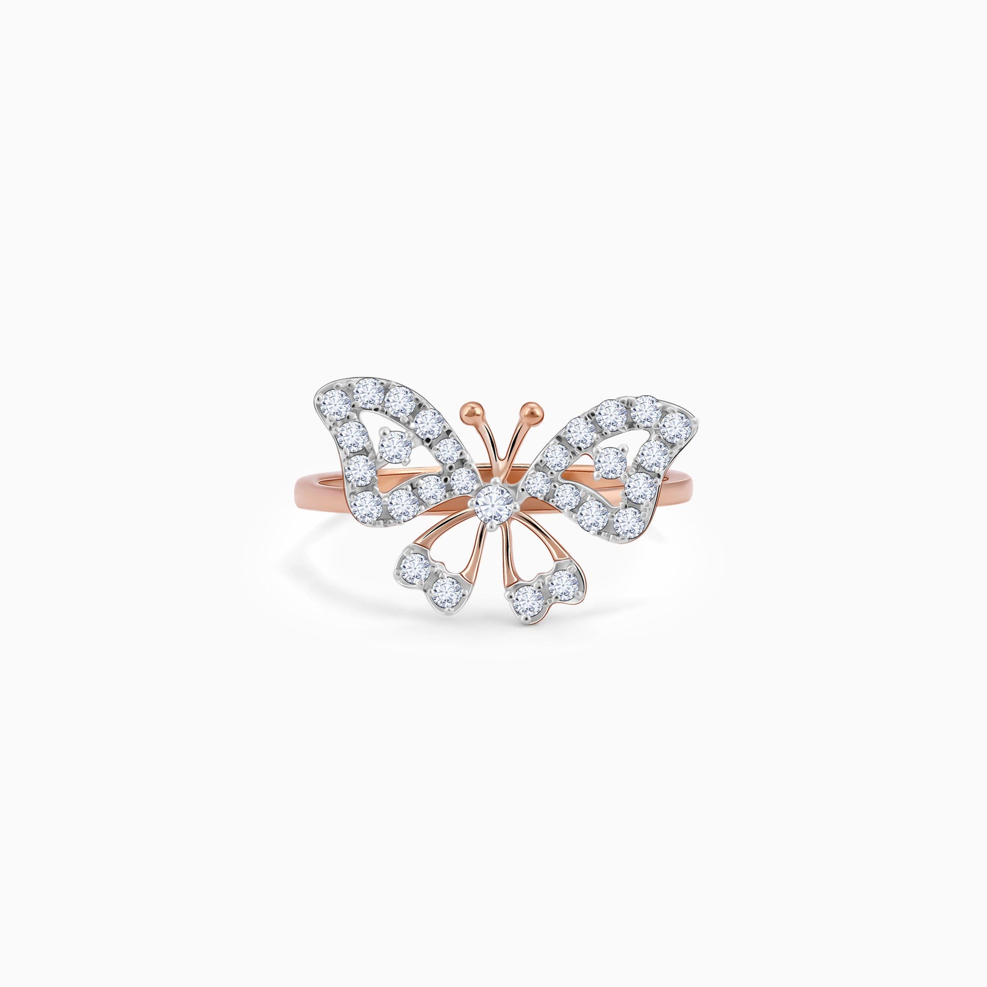 This pure rose gold ring for women features a butterfly motif set with lab grown diamonds.