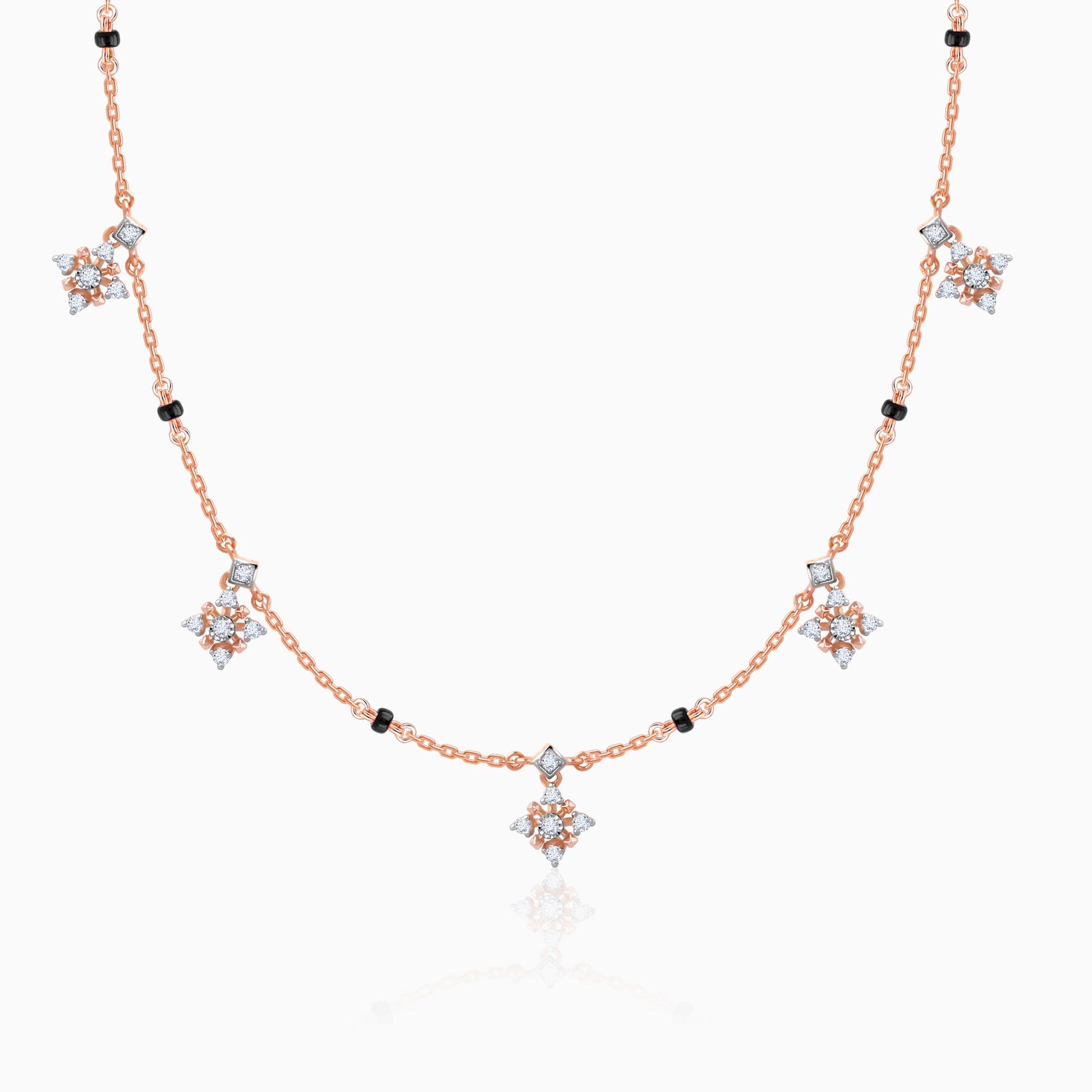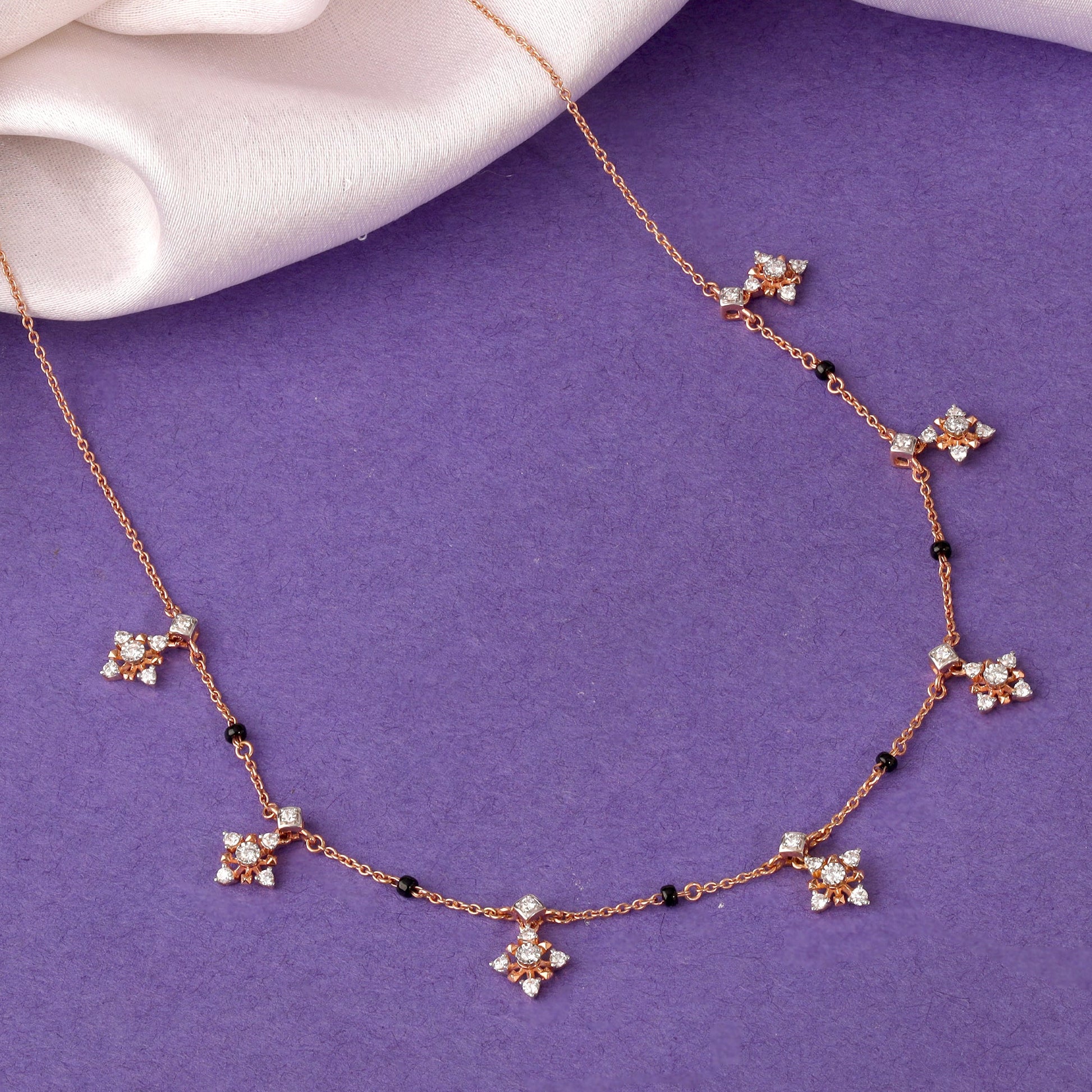 This pure rose gold necklace for women features evenly spaced square charms set with lab grown diamonds. Small black beads are interspersed between them, creating a charming and intricate pattern.