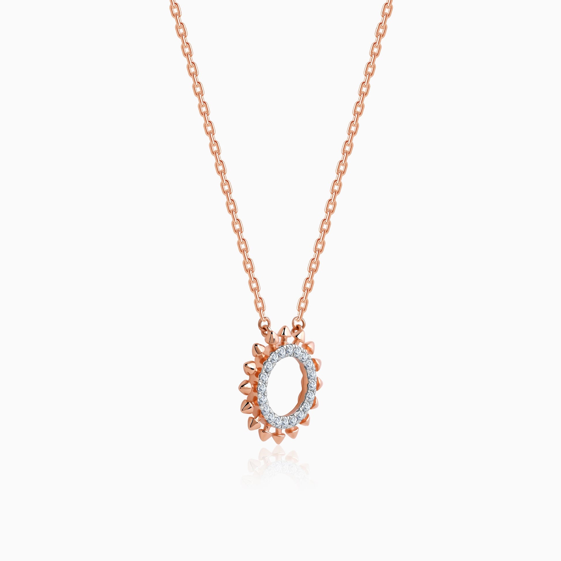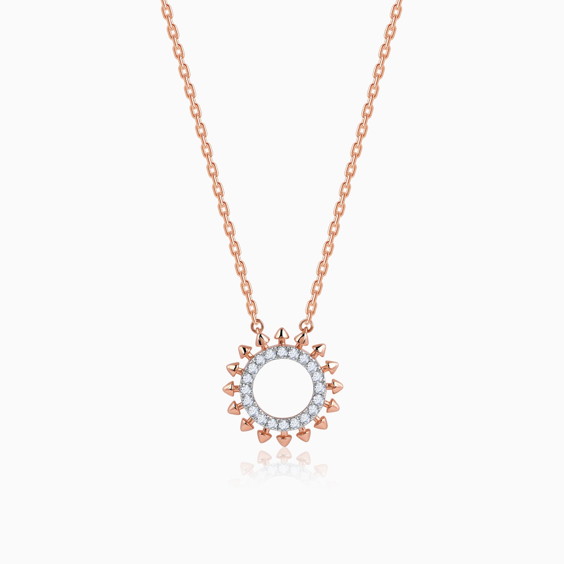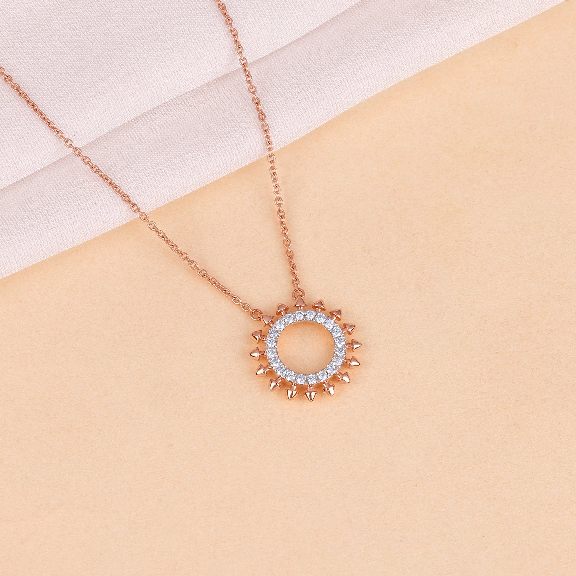 This pure rose gold necklace for women has a circular shape studded with lab grown diamonds. Radiating outwards from this central ring are pointed, golden protrusions, reminiscent of sun rays or spikes, giving the pendant a modern and somewhat edgy aesthetic.