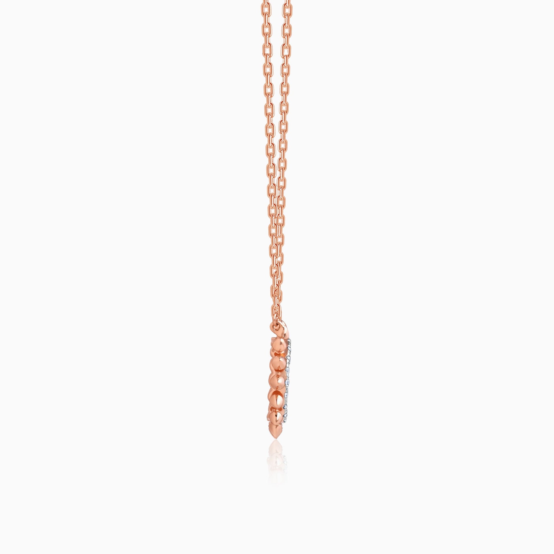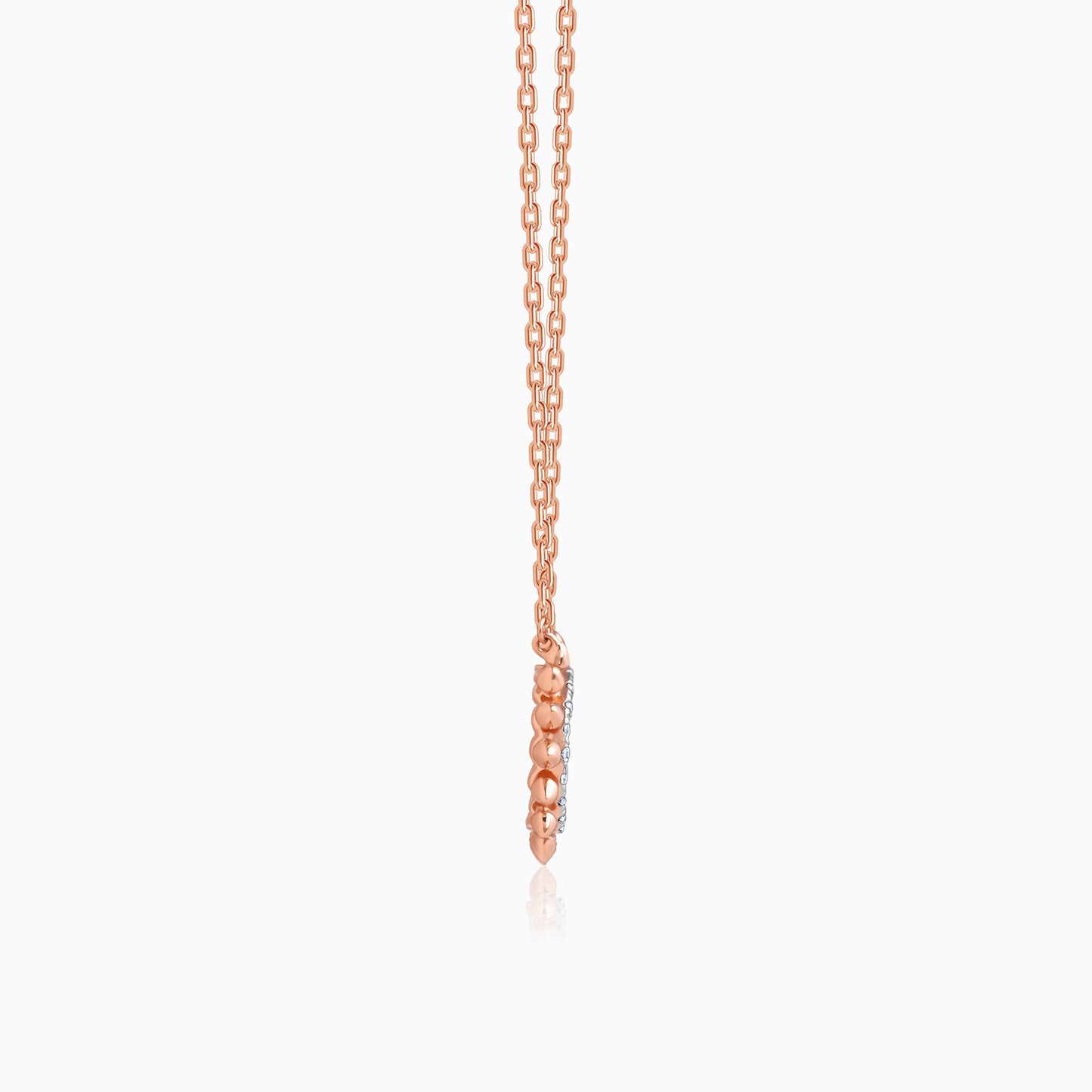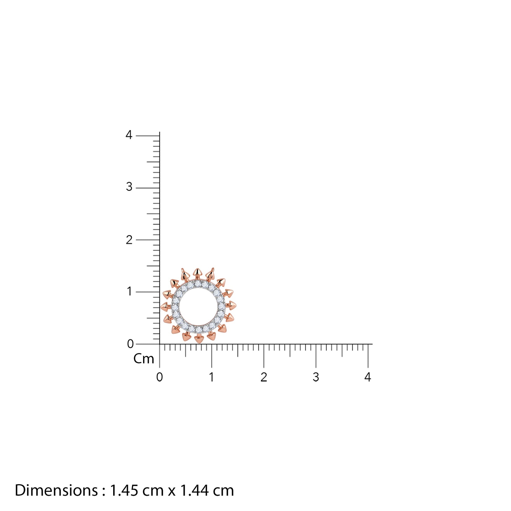 This pure rose gold necklace for women has a circular shape studded with lab grown diamonds. Radiating outwards from this central ring are pointed, golden protrusions, reminiscent of sun rays or spikes, giving the pendant a modern and somewhat edgy aesthetic.