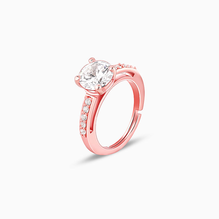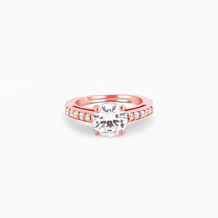 This rose gold ring has a circular zircon in a four-prong setting on a band set with zircons.