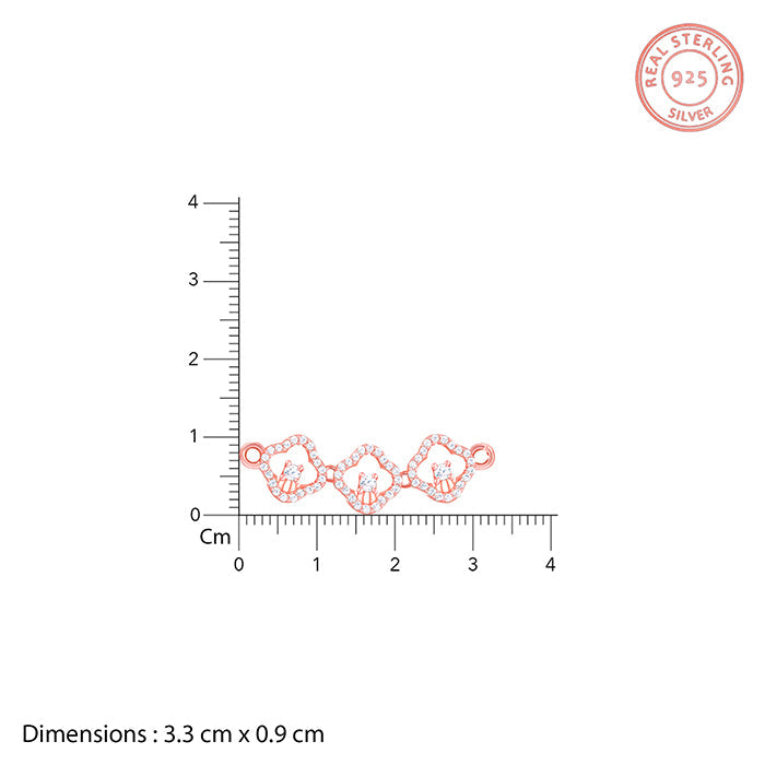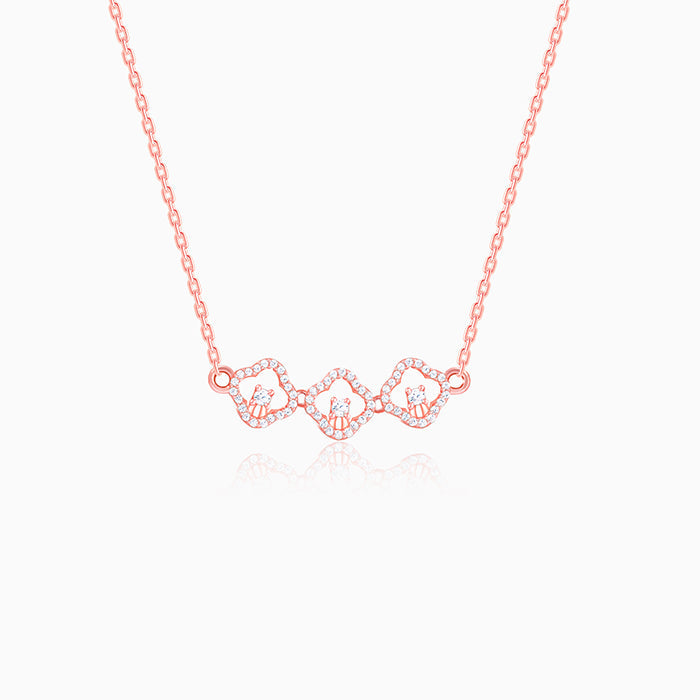 This rose gold plated necklace for women features three zircon-studded quatrefoil frames. Each frame has a zircon set at the centre.