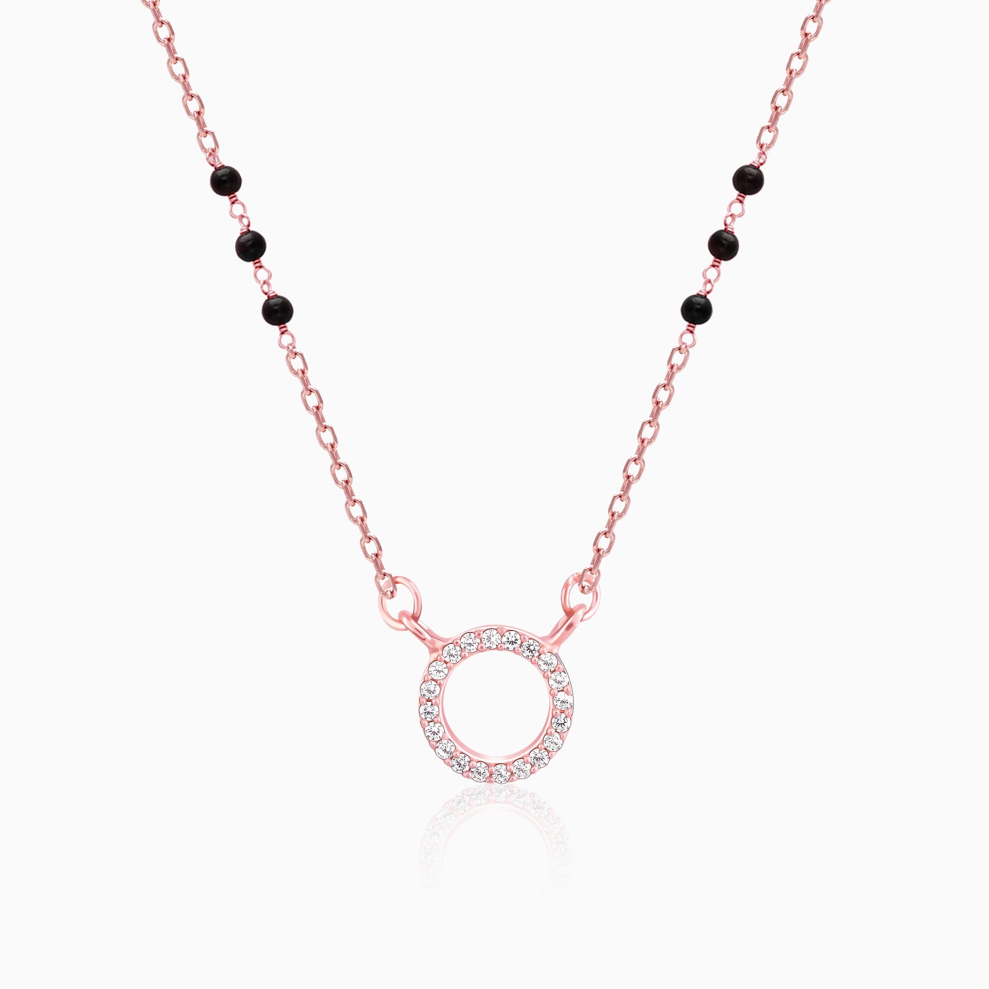 The Rose gold mangalsutra is connected with a circle of life pendant in the centre