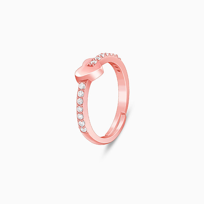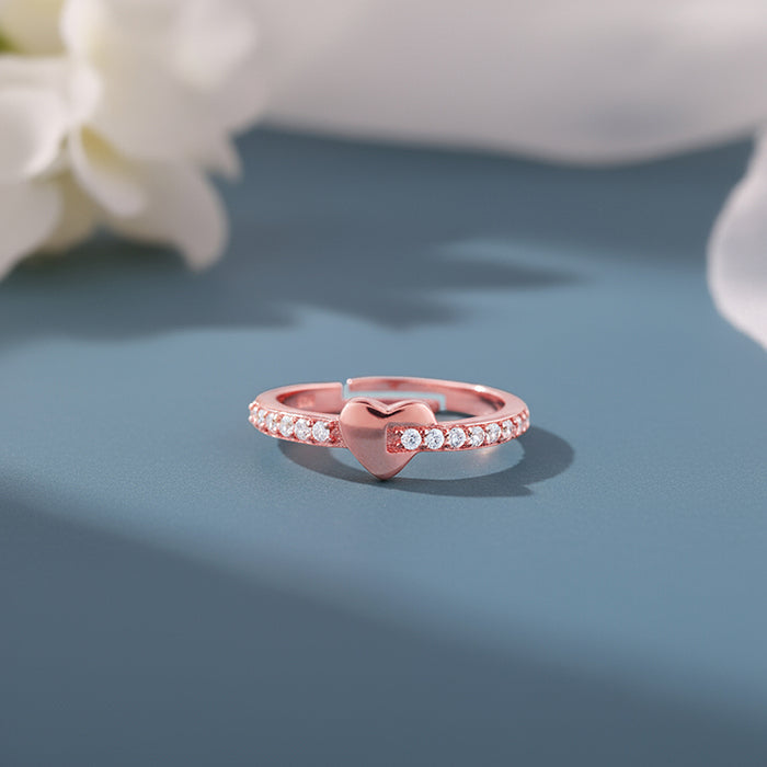 Every heart tells a story, and this rose gold ring lets yours shine. Its charming heart centerpiece, embraced by a band studded with zircons, transforms a simple gesture into a memory that sparkles every time it catches the light.