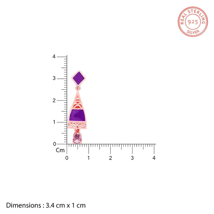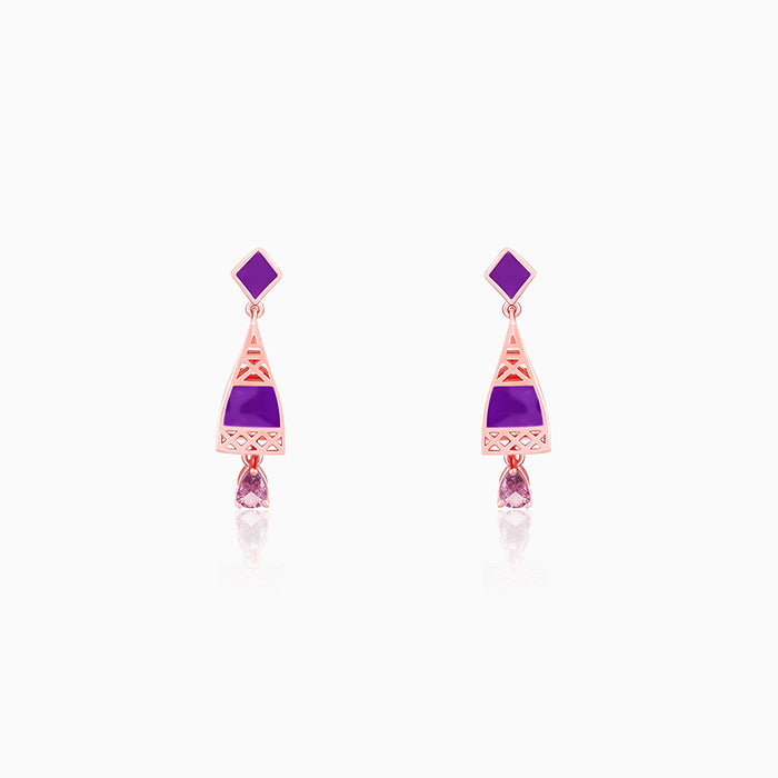 These rose gold earrings have an Eiffel Tower motif with lilac enamel and a lilac-coloured stone dangling below.