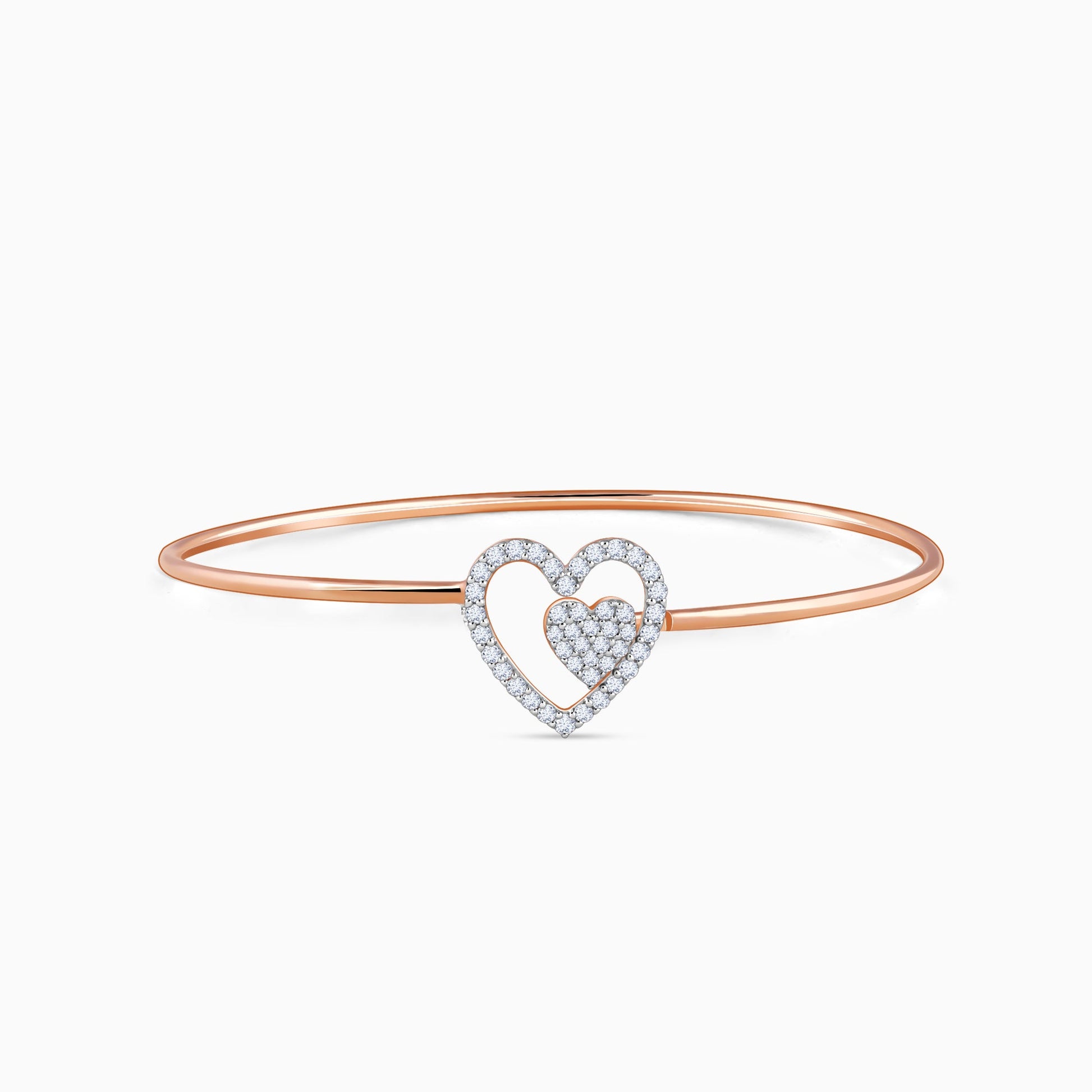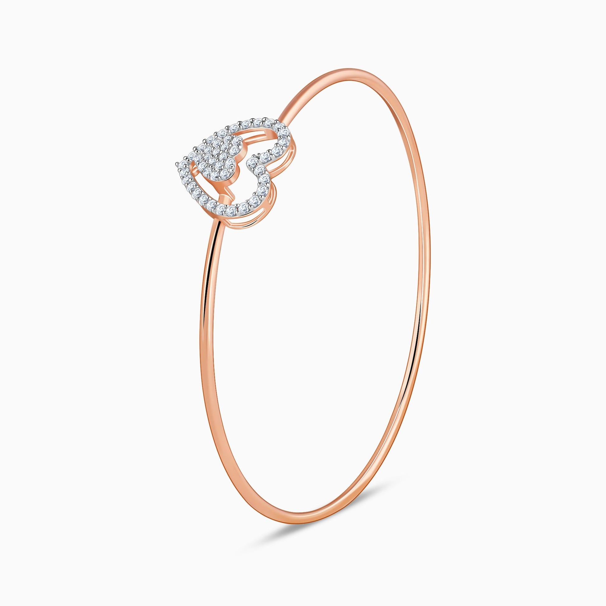 This gold bangle bracelet for women features twin heart motifs encrusted with lab grown diamonds.