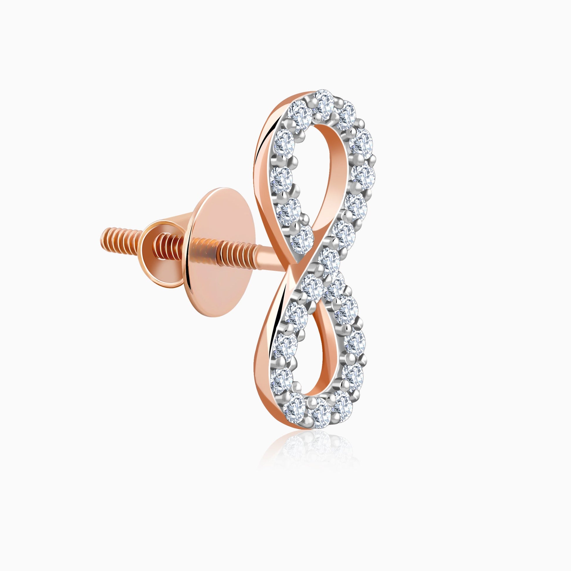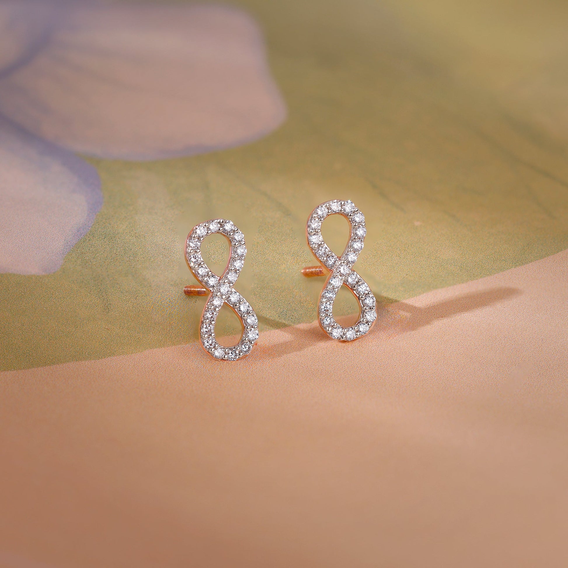 These rose gold earrings for women feature an infinity symbol encrusted with lab grown diamonds.