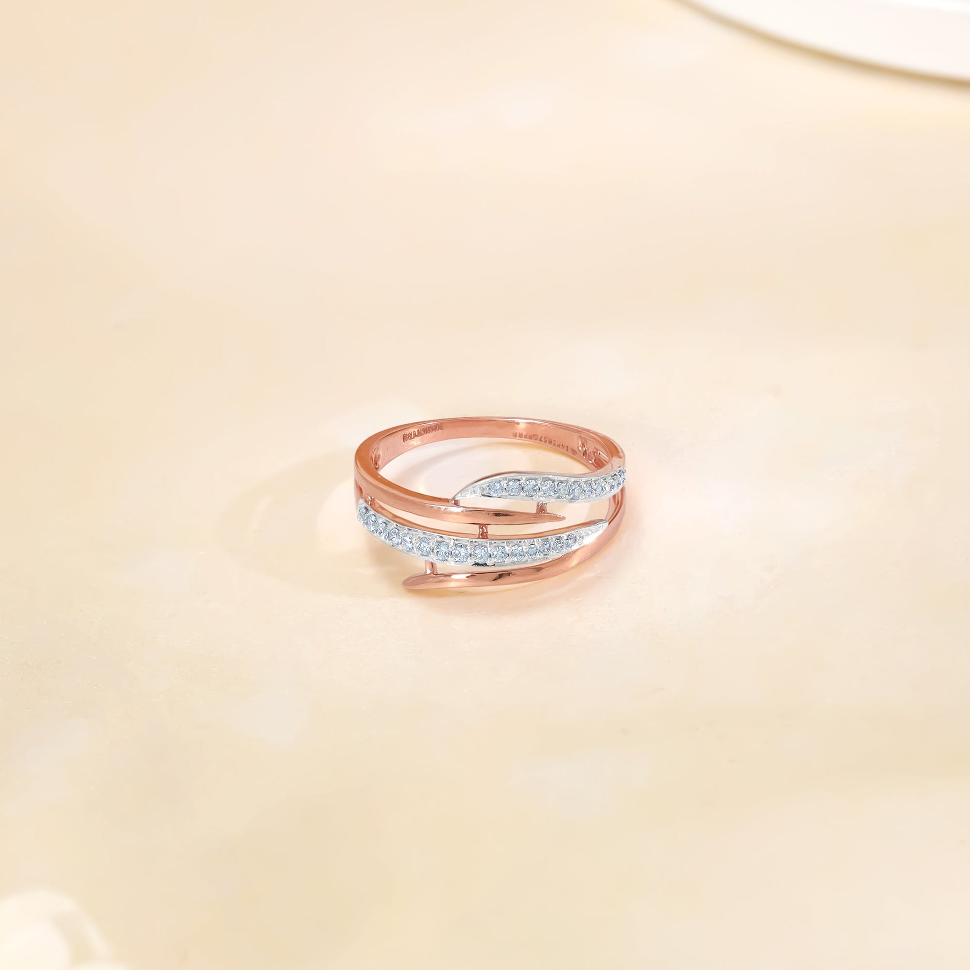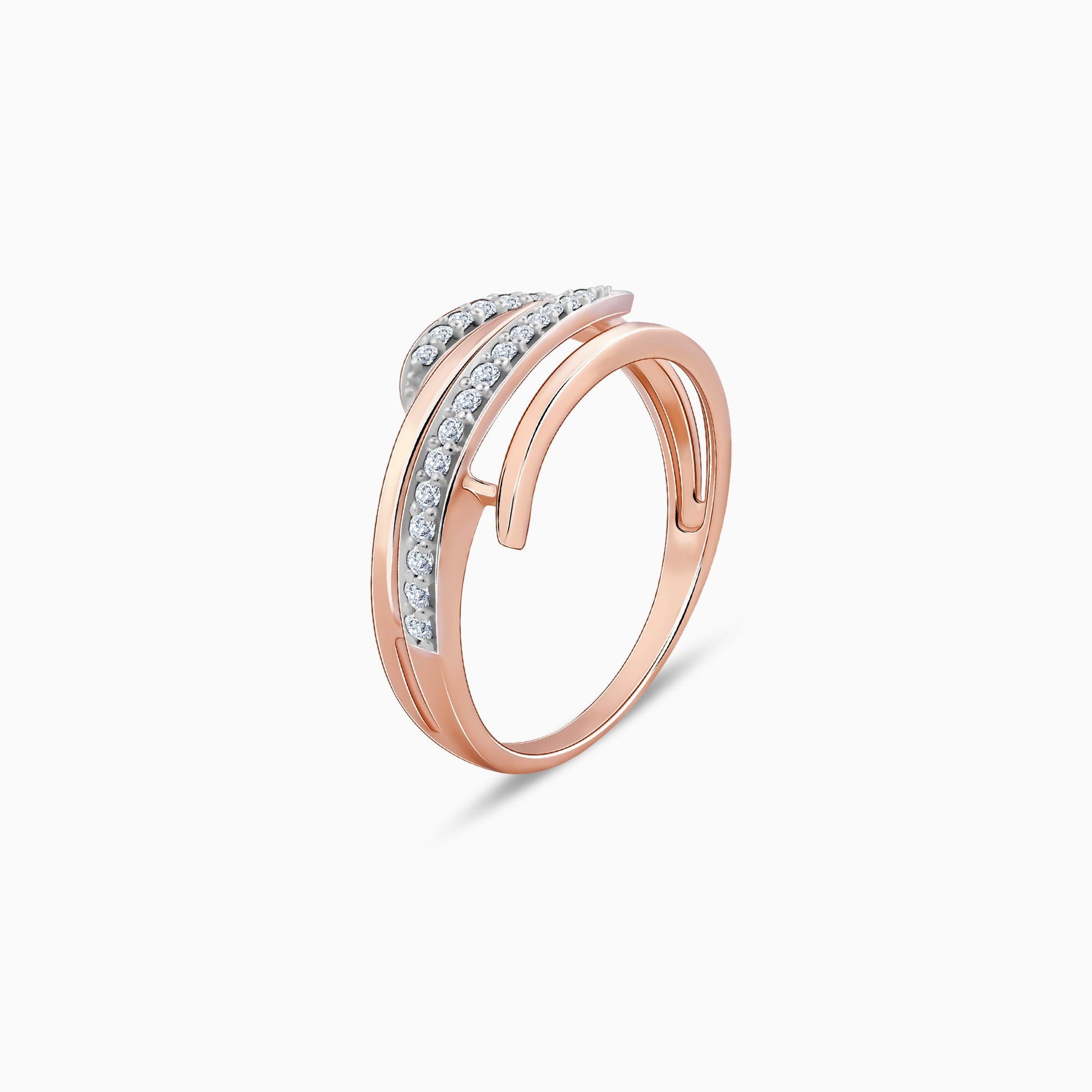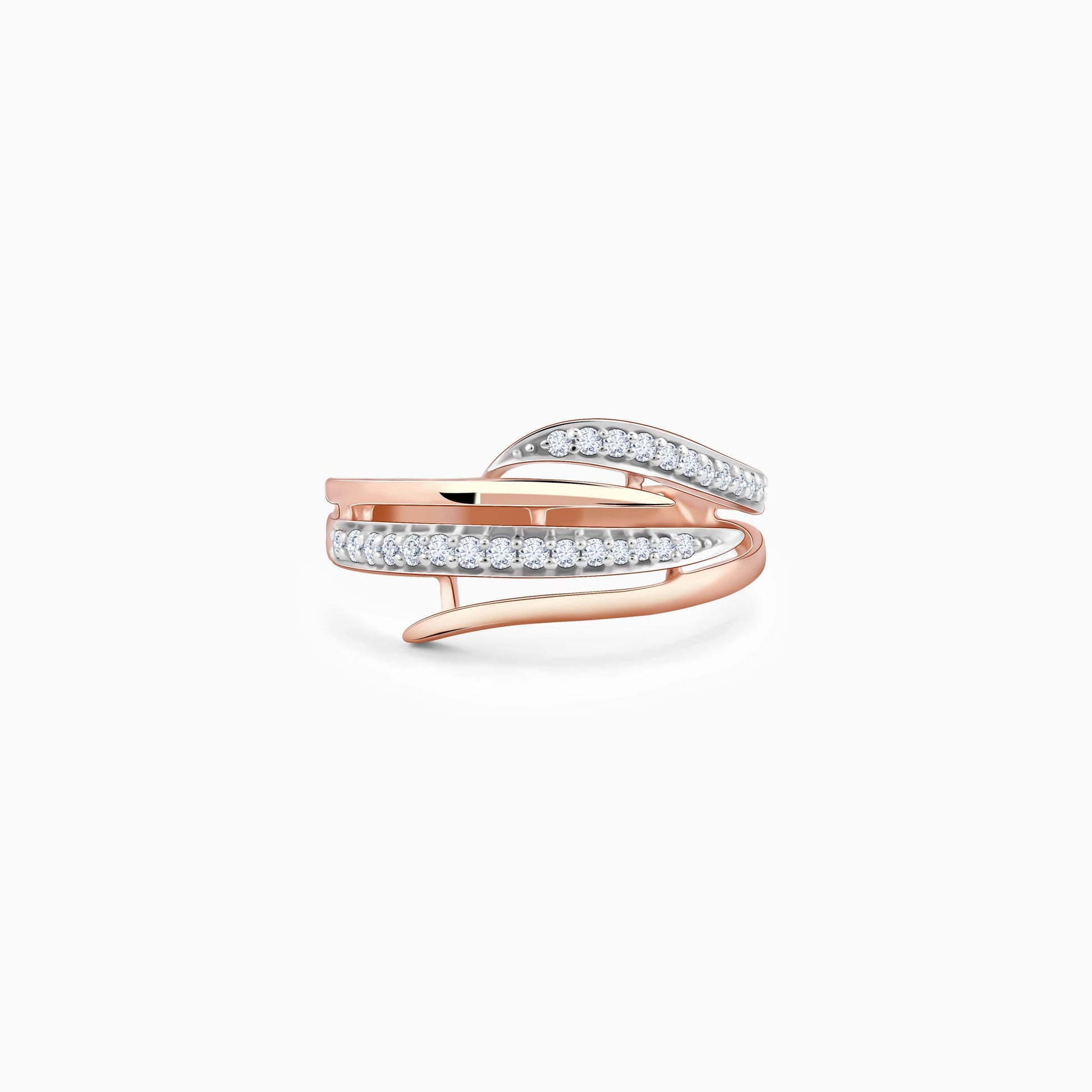 This pure rose gold ring for women features an elegant abstract band diverging into four flowy parallel lines. Two of the lines feature lab grown diamonds in a pave setting.