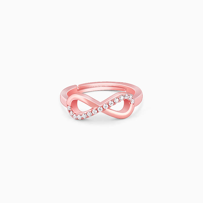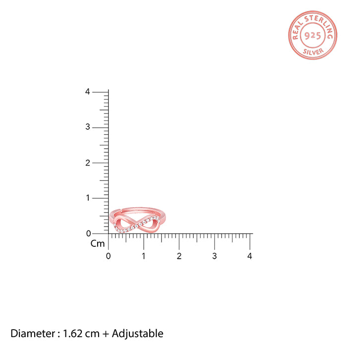 This rose gold ring has an infinity motif having one diagonal set with zircons.