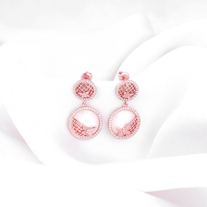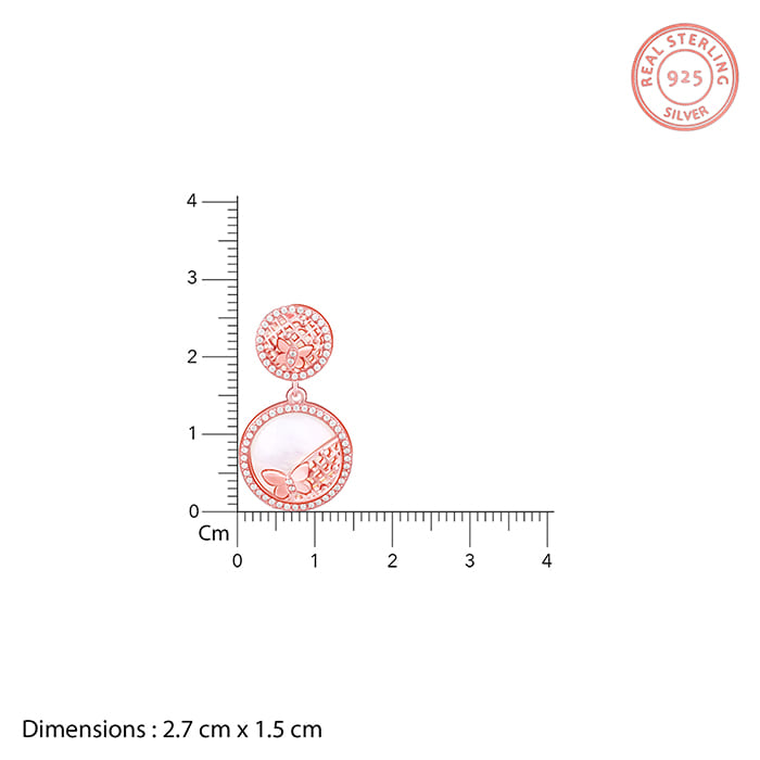 These rose gold earrings have a circle motif with a filigree design with mother of pearl placed inside and zircon studded around.