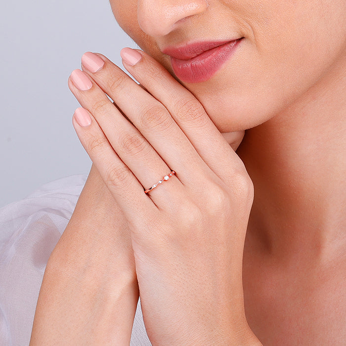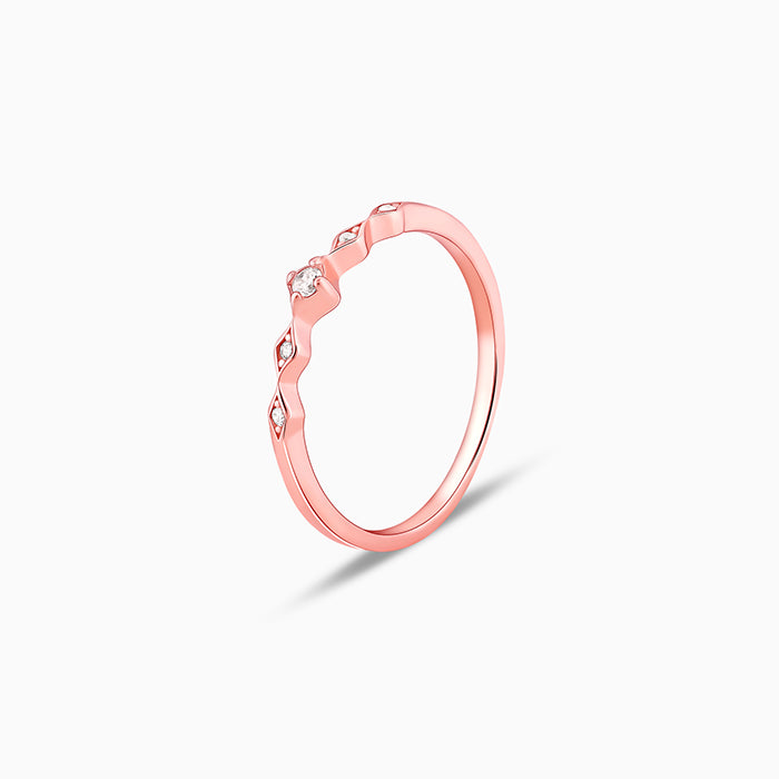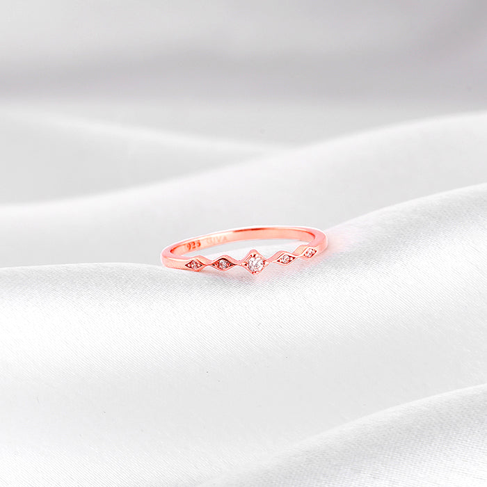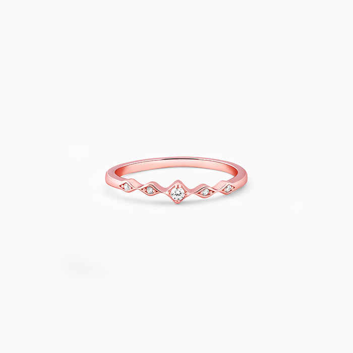 This rose gold ring features a rhombus motif at the centre, with two oval designs on both sides studded with zircons.
