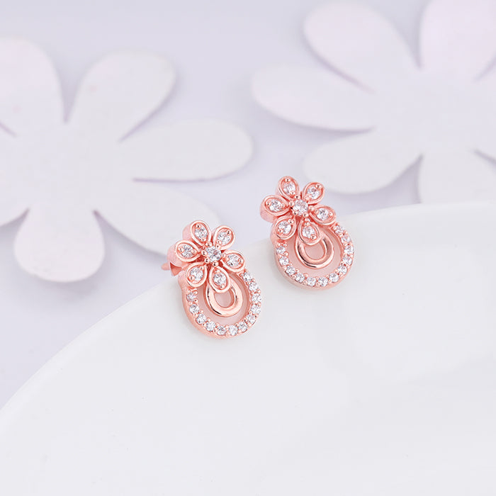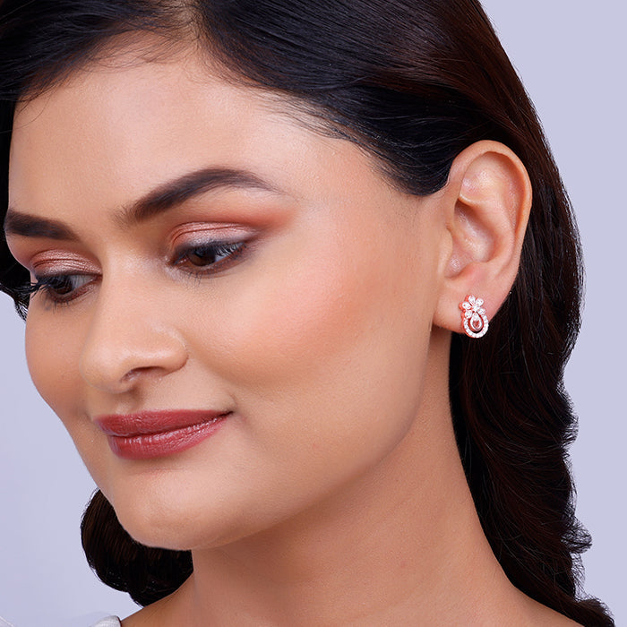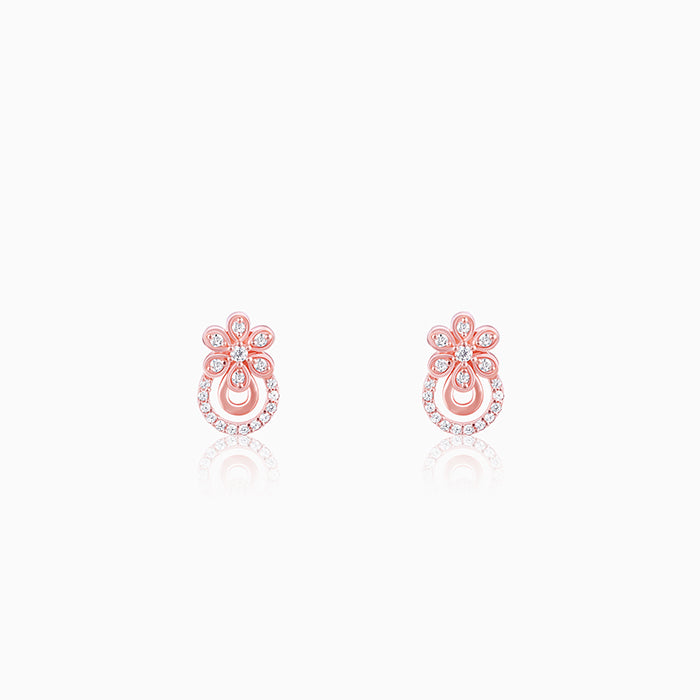 These rose gold earrings have a floral motif studded with zircons on two arches - at the bottom, the flower design is accompanied by a plain inner ring.
