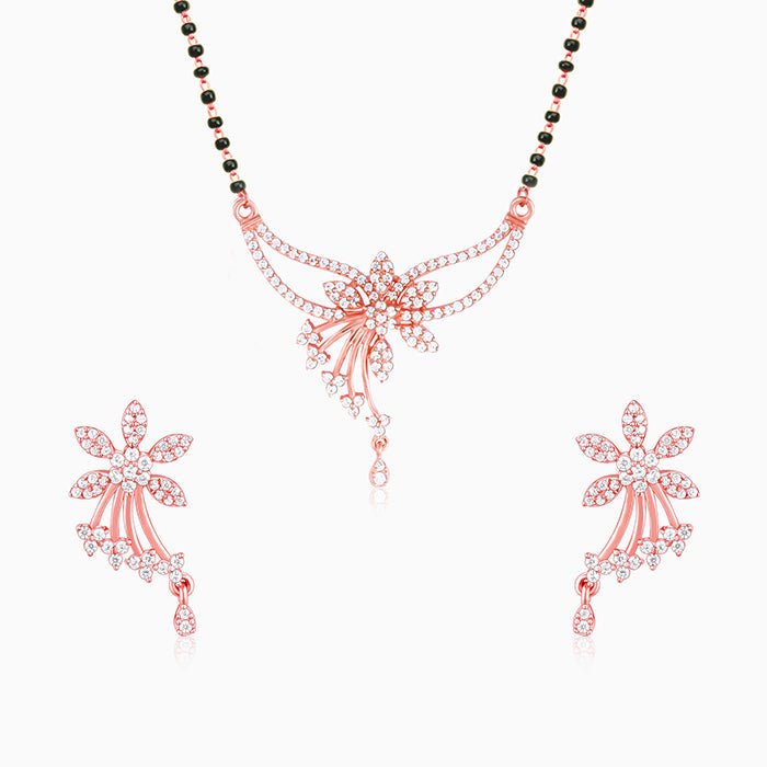 This rose gold set has a mangalsutra and a pair of earrings, each featuring an intricate floral design studded with zircons.