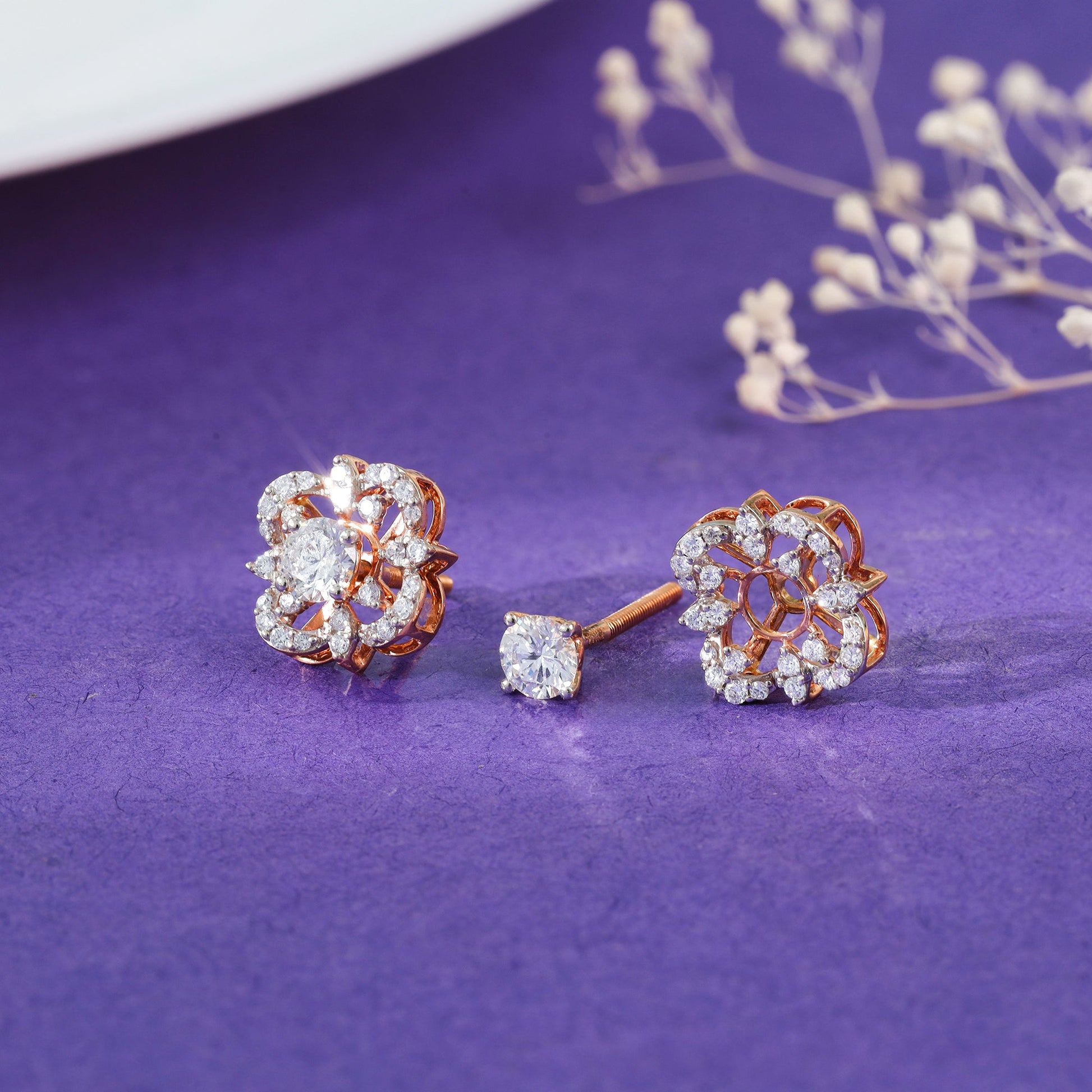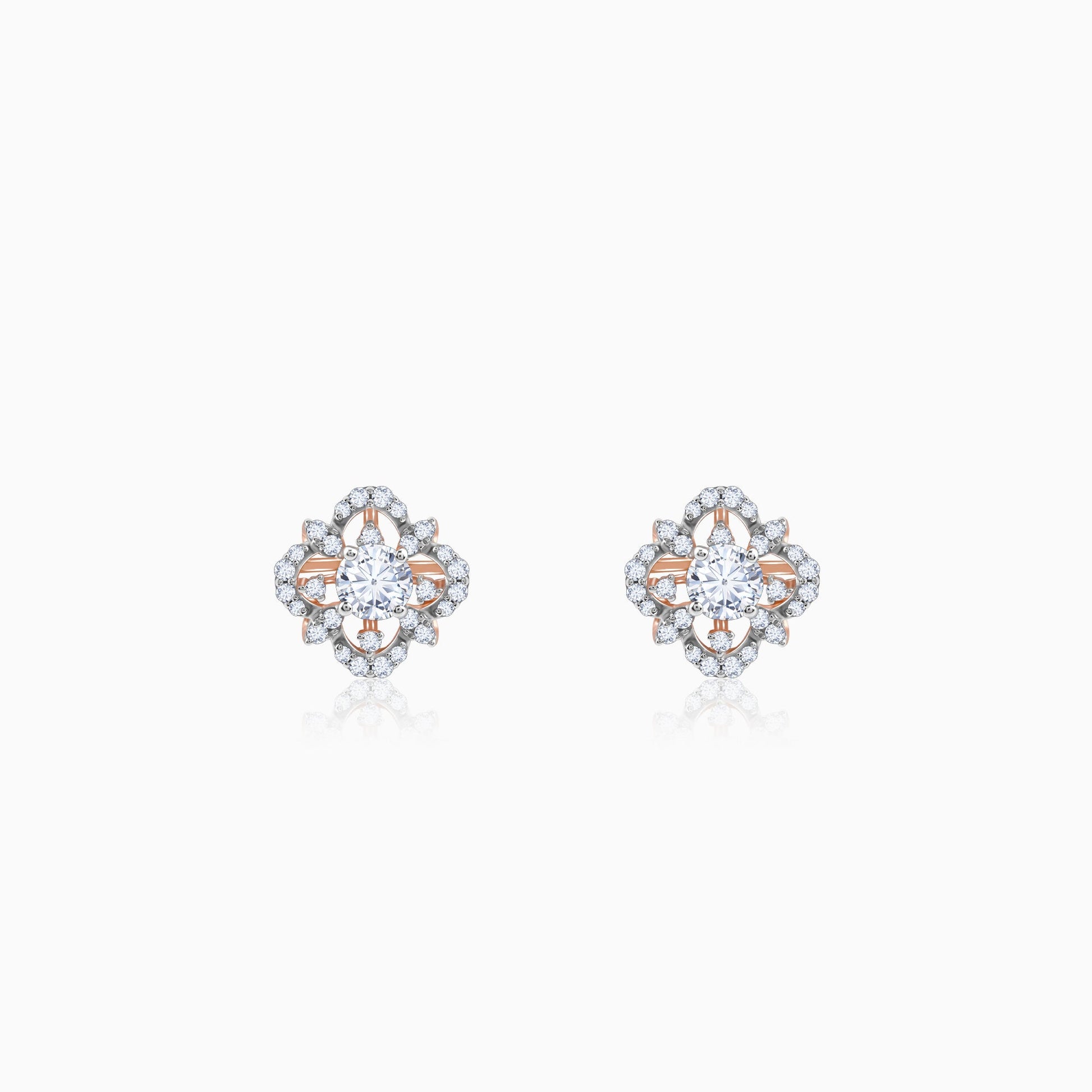 These pure rose gold earrings for women feature a floral design with lab grown diamonds enhancing the overall appeal.