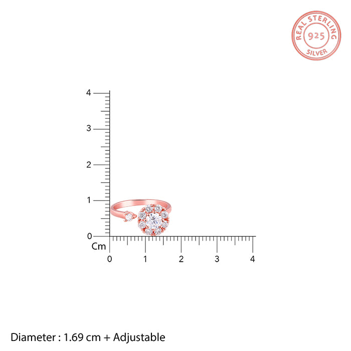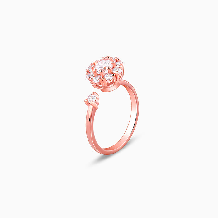 This rose gold ring features an open design. One edge showcases a flower motif studded with zircons that spins, while the other edge has a heart motif with zircons.
