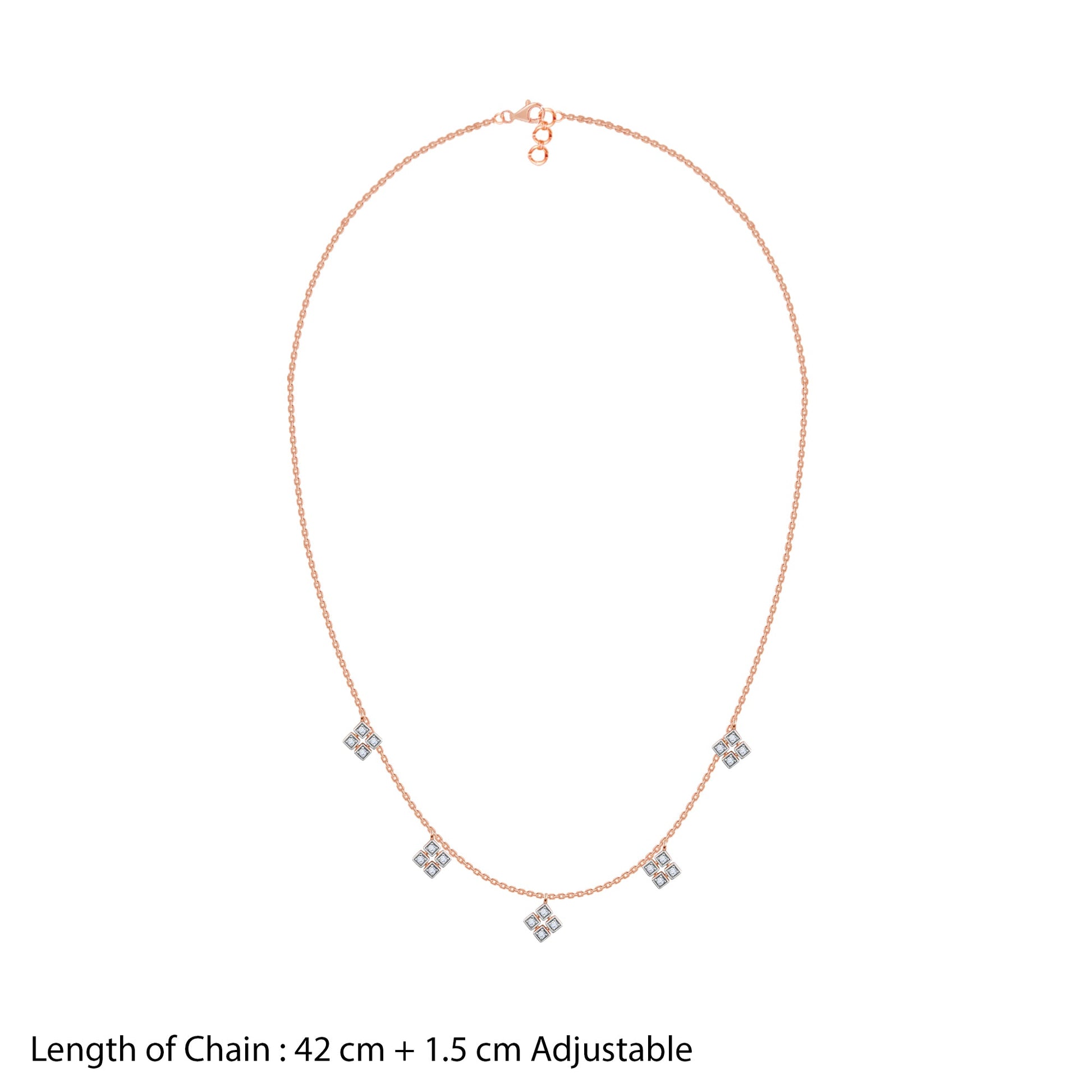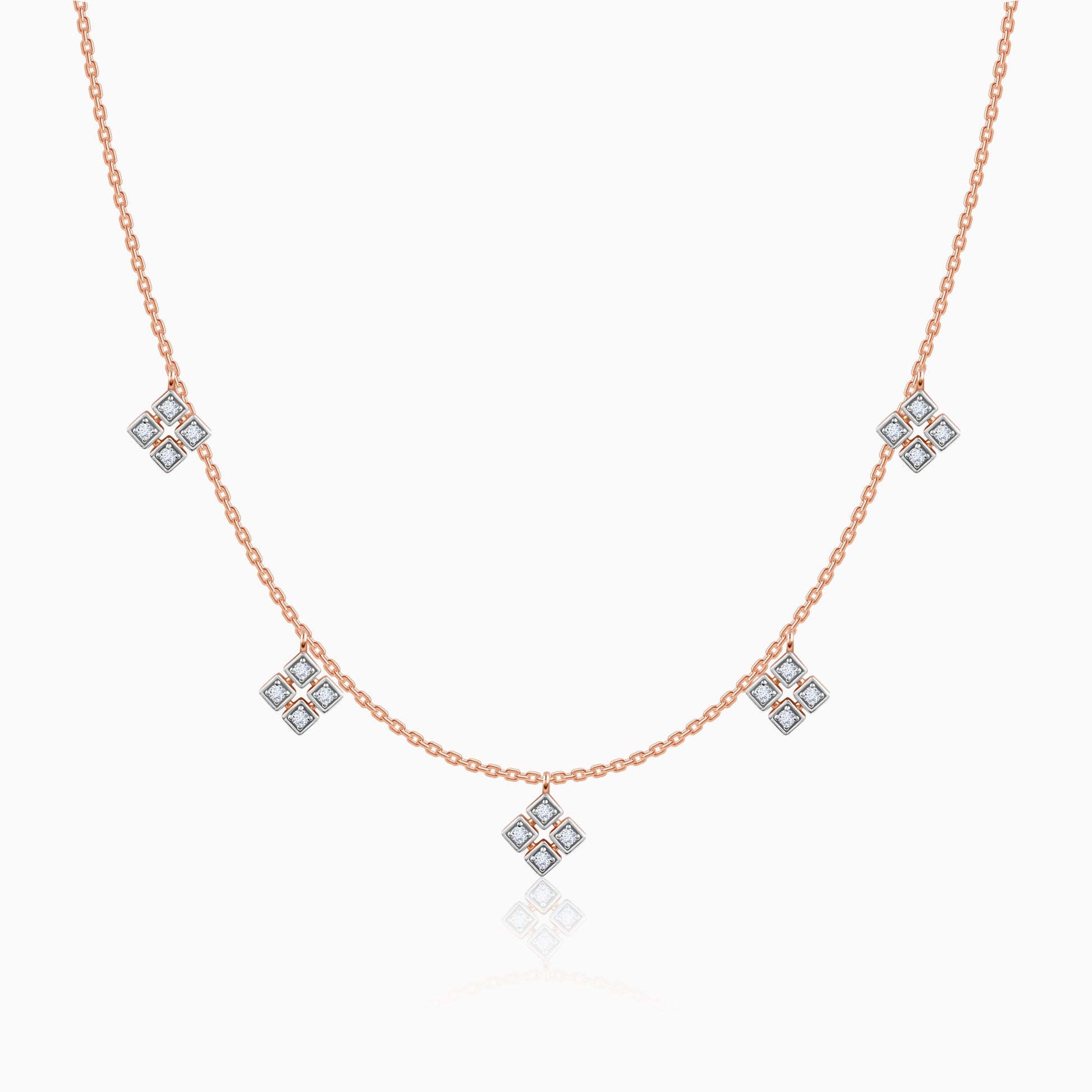 This rose gold necklace for women features five evenly spaced, diamond-shaped motifs, each intricately detailed with lab grown diamonds adding a touch of geometric elegance .