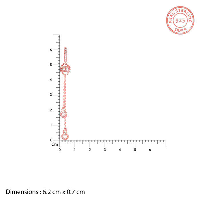 These rose gold plated earrings for women feature a zircon-studded sleek bar as the upper dangle. Two circular zircons in a bezel setting hang from the chain, slightly spaced away from each other. Another horizontally placed circular motif studded with zircons sits on the top, just below the upper dangle.