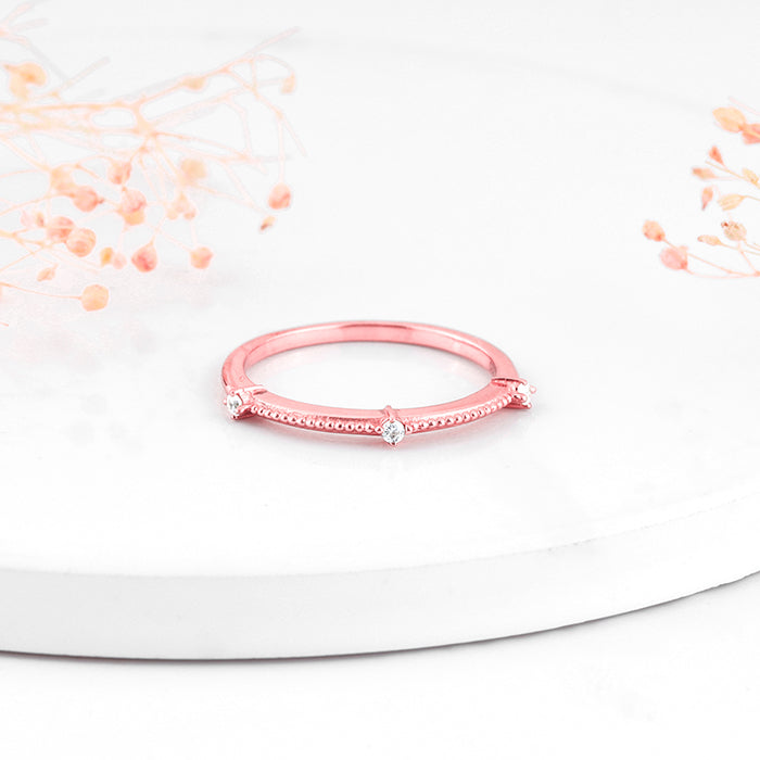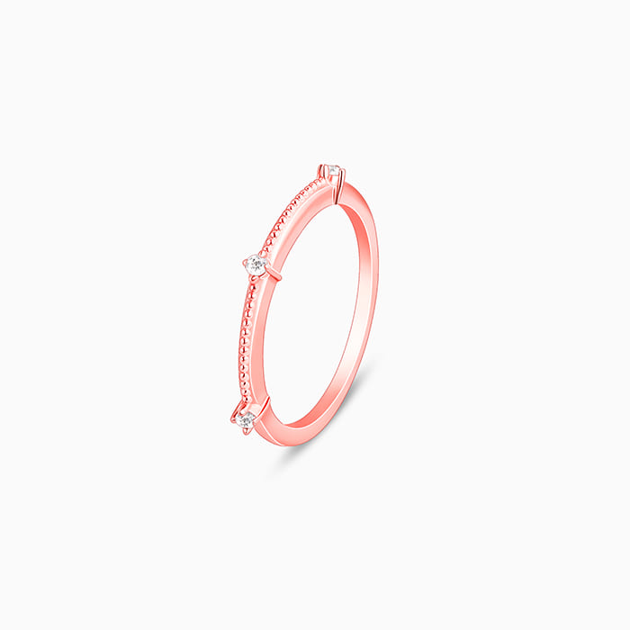 This rose gold ring features three zircons spread out pointing at three directions. Intricate bead designs separate them.