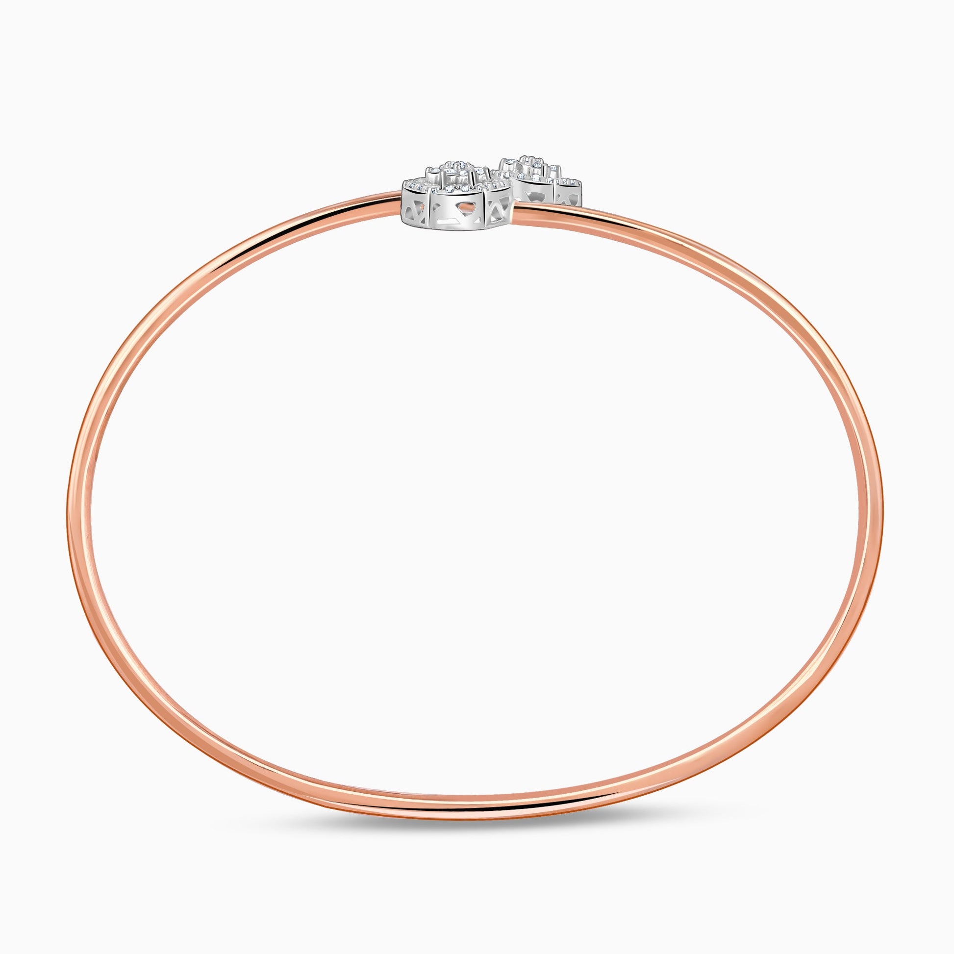 This pure rose gold bracelet features an open bangle design with the ends forming hexagons, studded with lab diamonds.