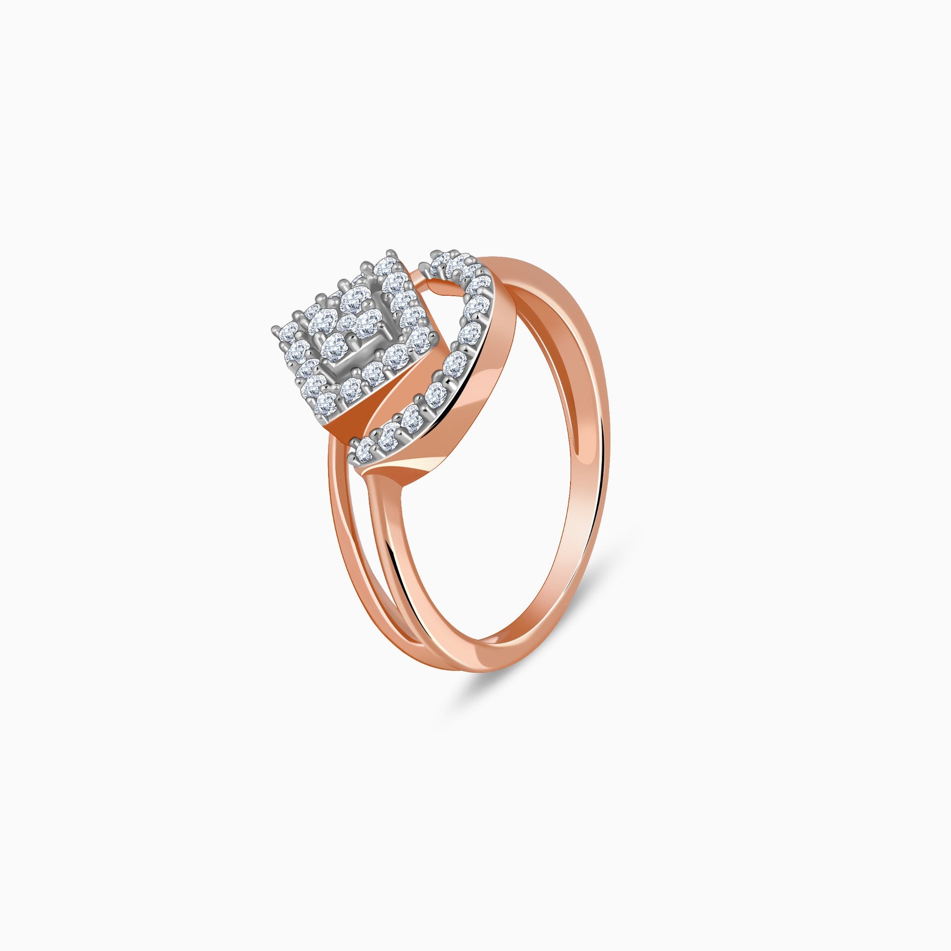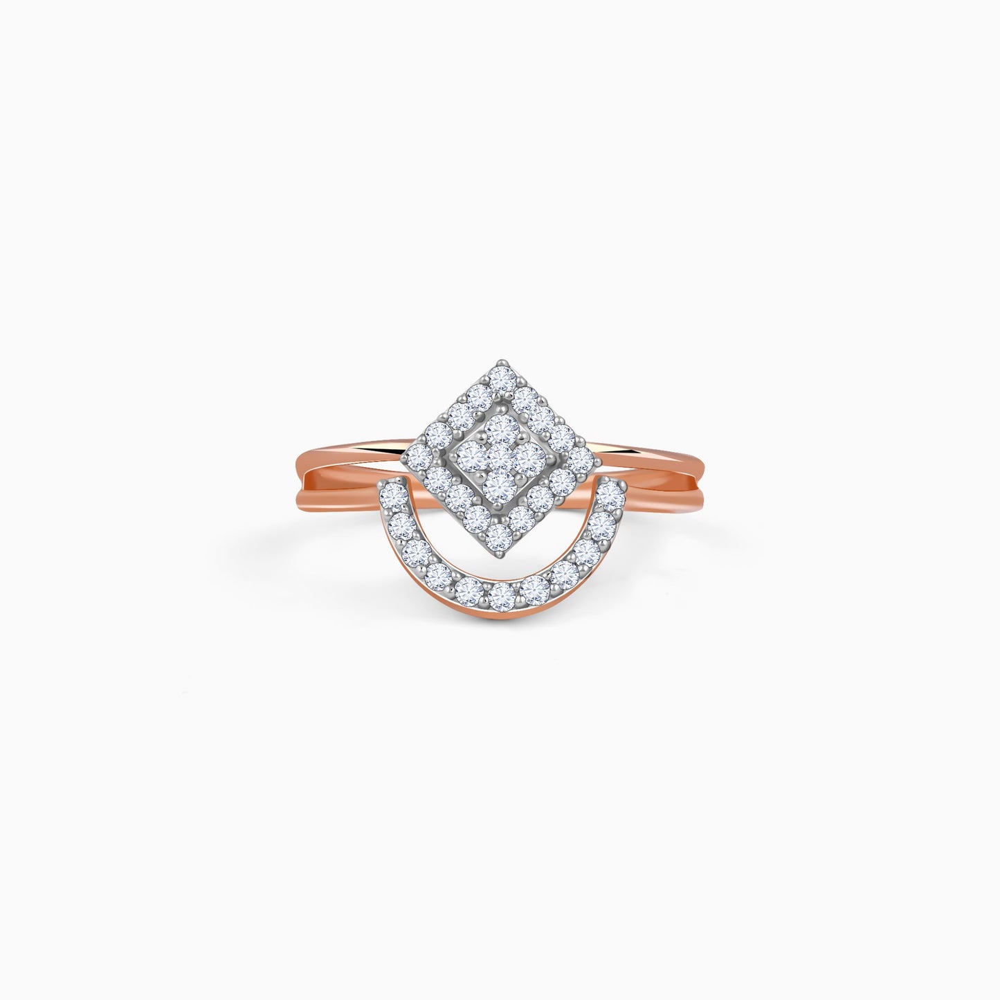 These womens pure rose gold earrings feature a split band with a rhombus at the head, studded with lab grown diamonds. A lab diamond-studded half circle beautifully enhances the look of the ring.