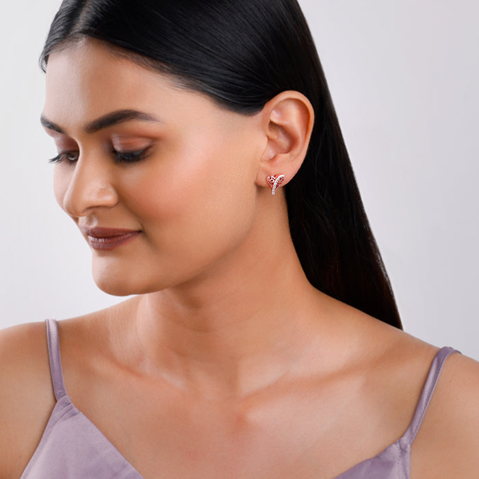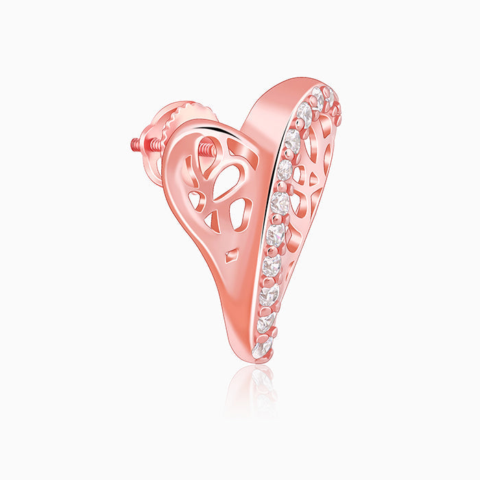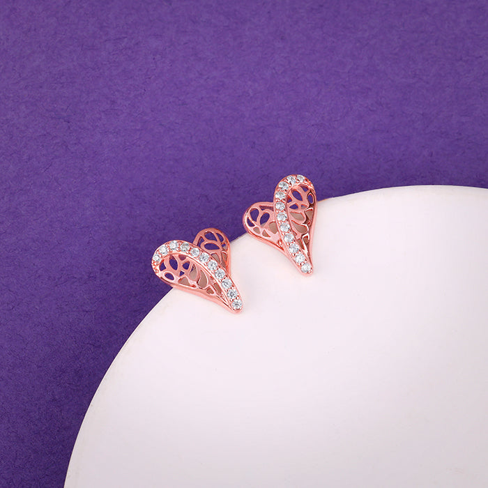 These rose gold plated studs for women featuire a stylised heart shape with intricate filigree patterns within. A curved line of zircons, beautifully separate the two sides of the heart.