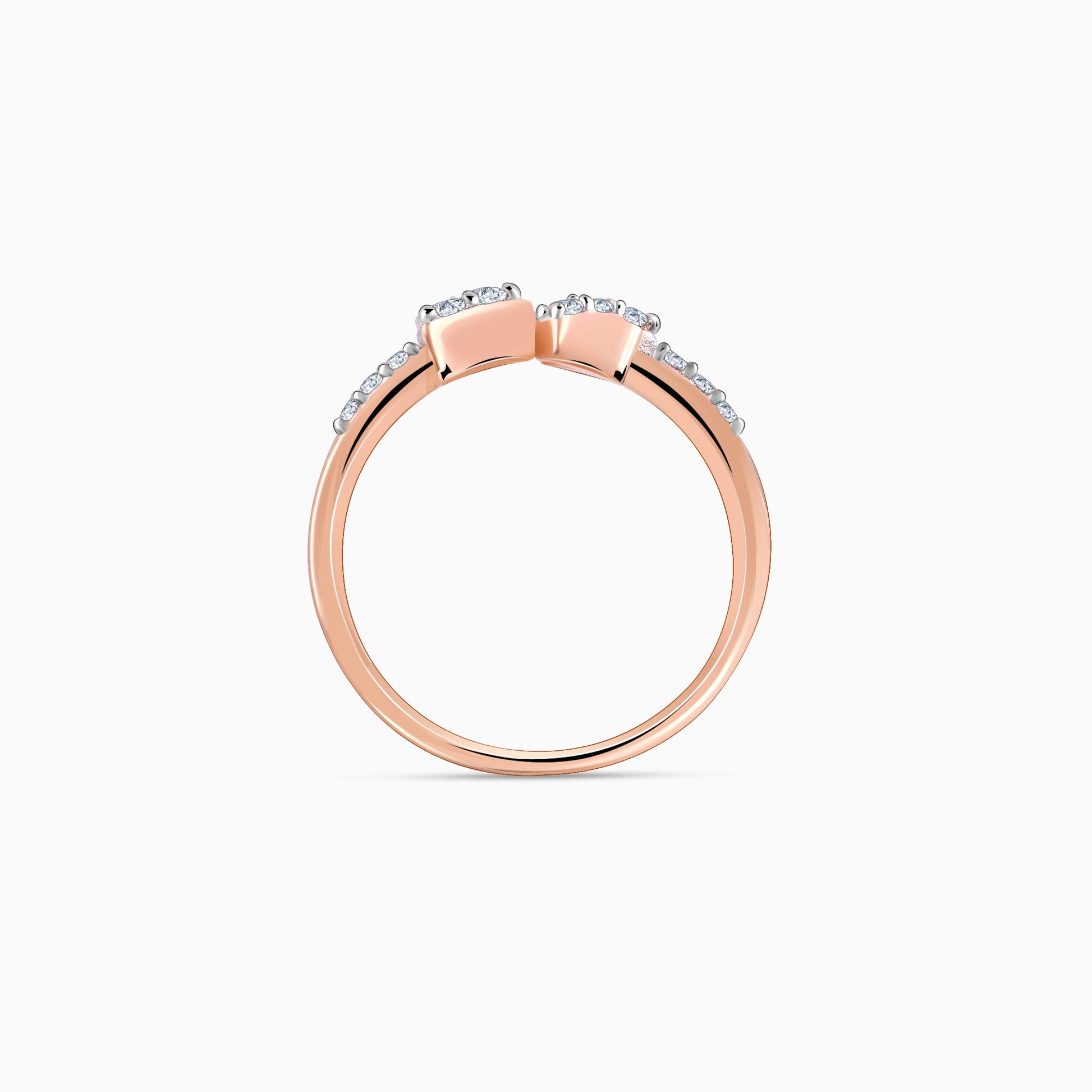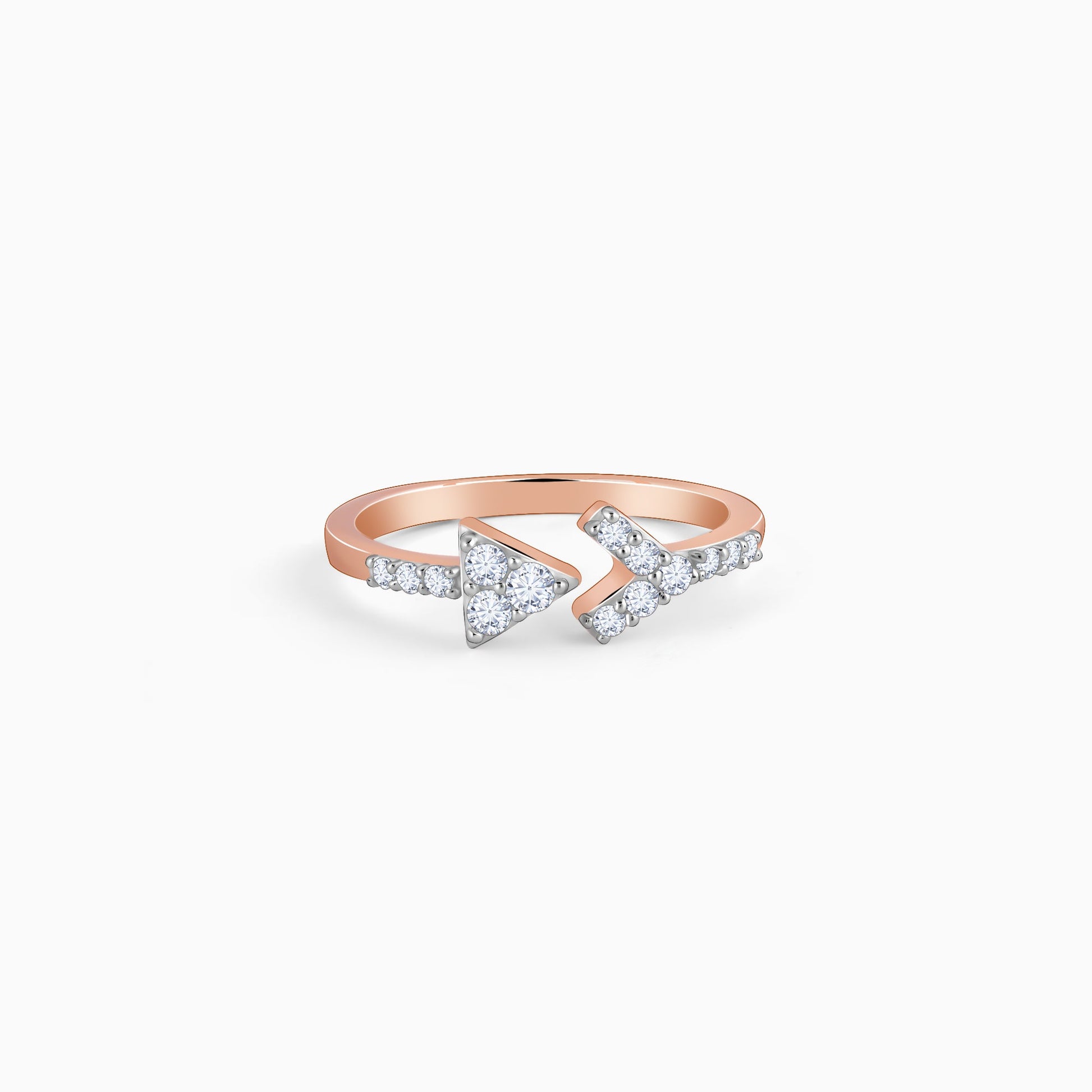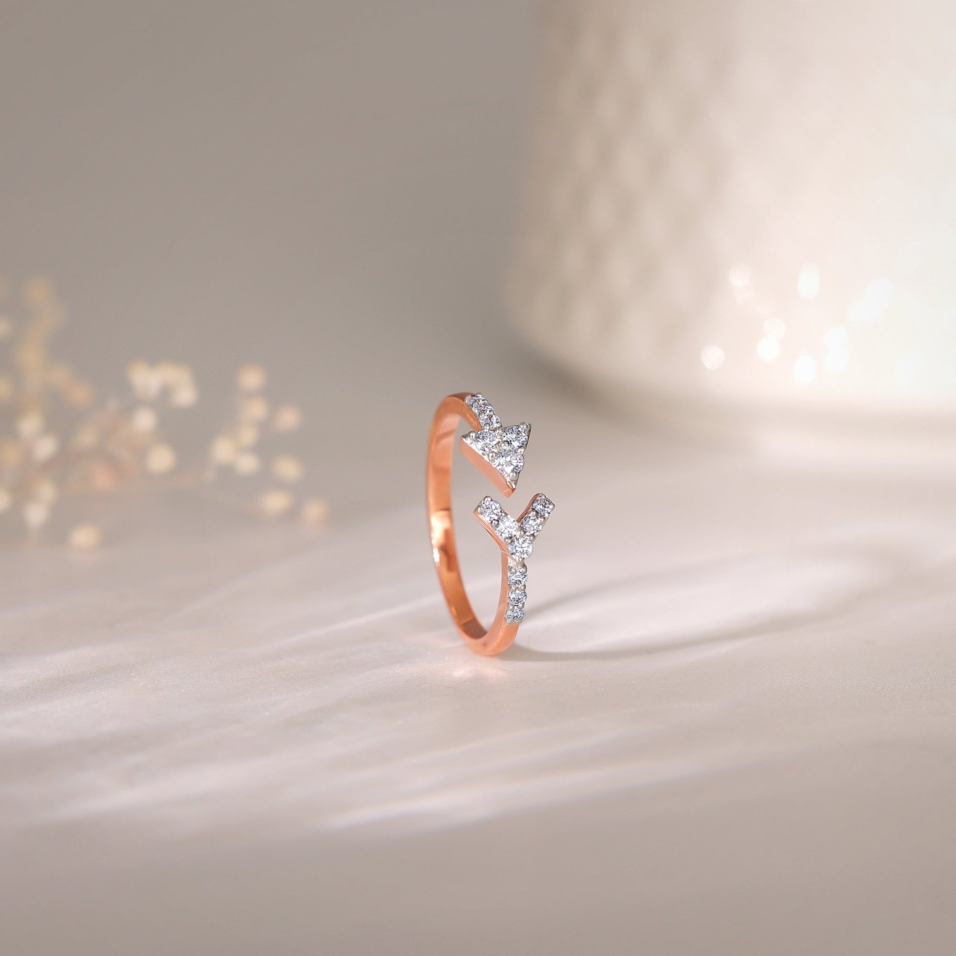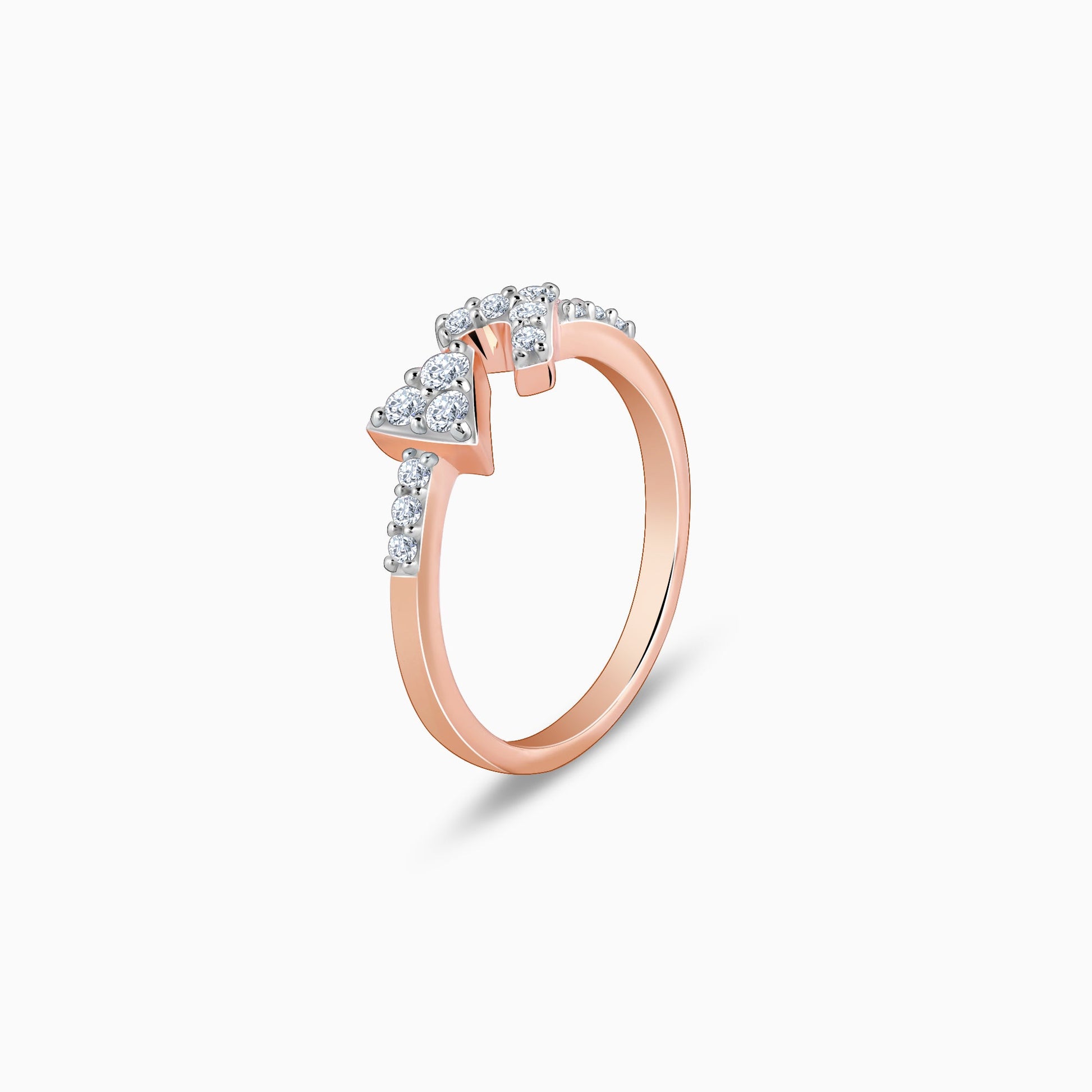 This pure rose gold ring features a unique arrow design with two interlocking prongs, set with sparkling diamonds along the prongs and band creating a modern and edgy look.
