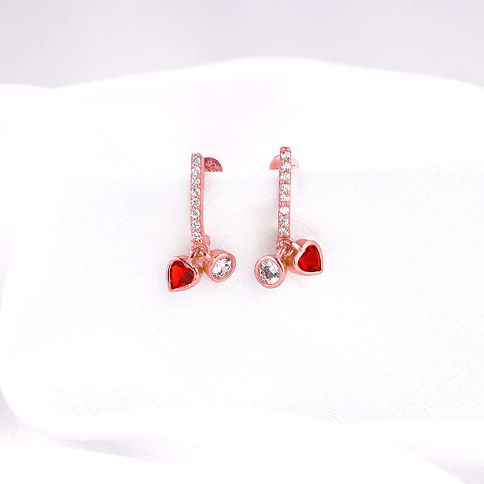 These rose gold earrings feature a hoop design studded with zircons with a cute heart motif which has a red-coloured stone placed inside attached below. Additionally, a circle motif is studded with a zircon. Celebrate your moments of passion with Trendy Freak’s Red Romance Collection.