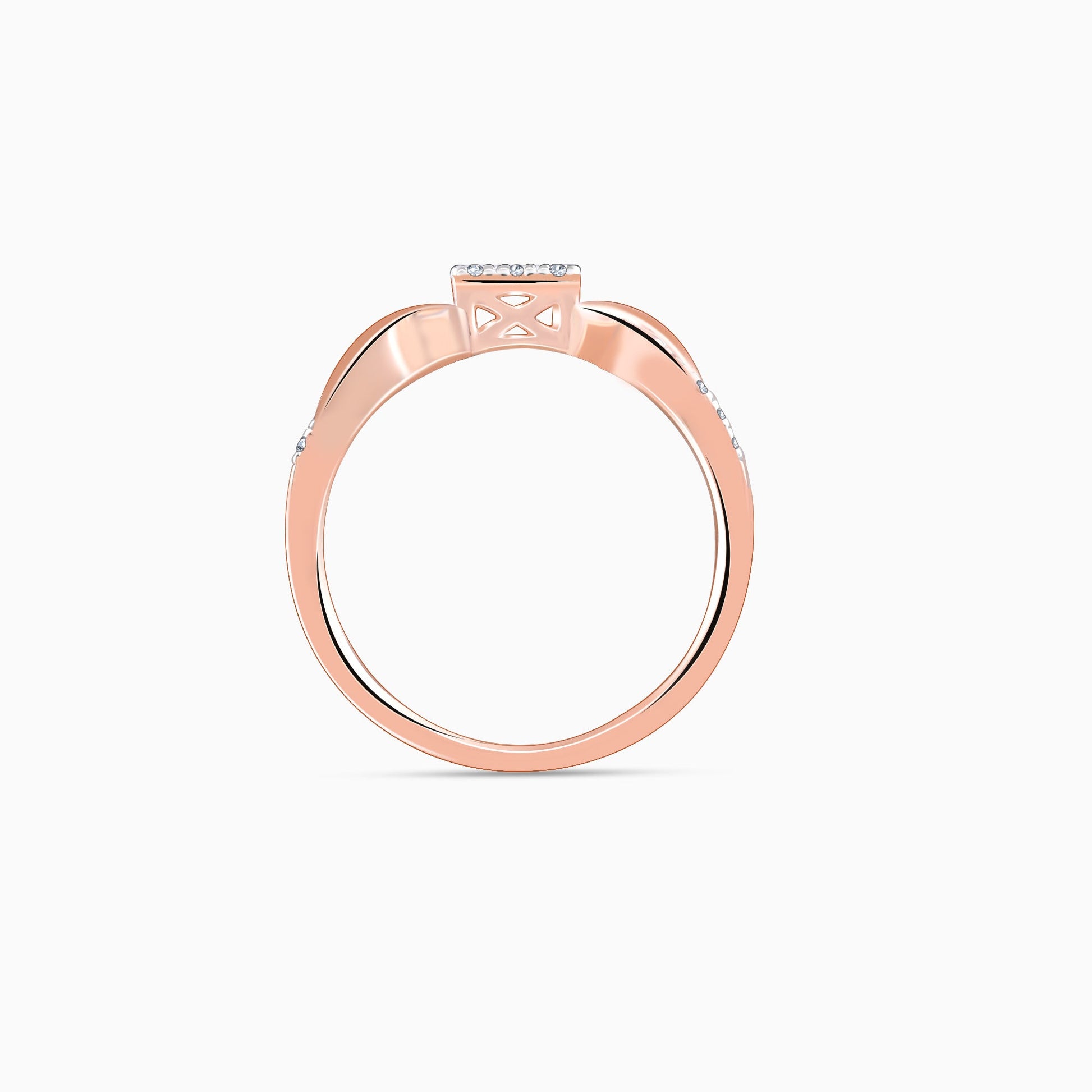 This pure rose gold ring for women features a central rectangular cluster of sparkling diamonds. It is flanked by swirling infinity-shaped bands on both sides, studded with lab grown diamonds.